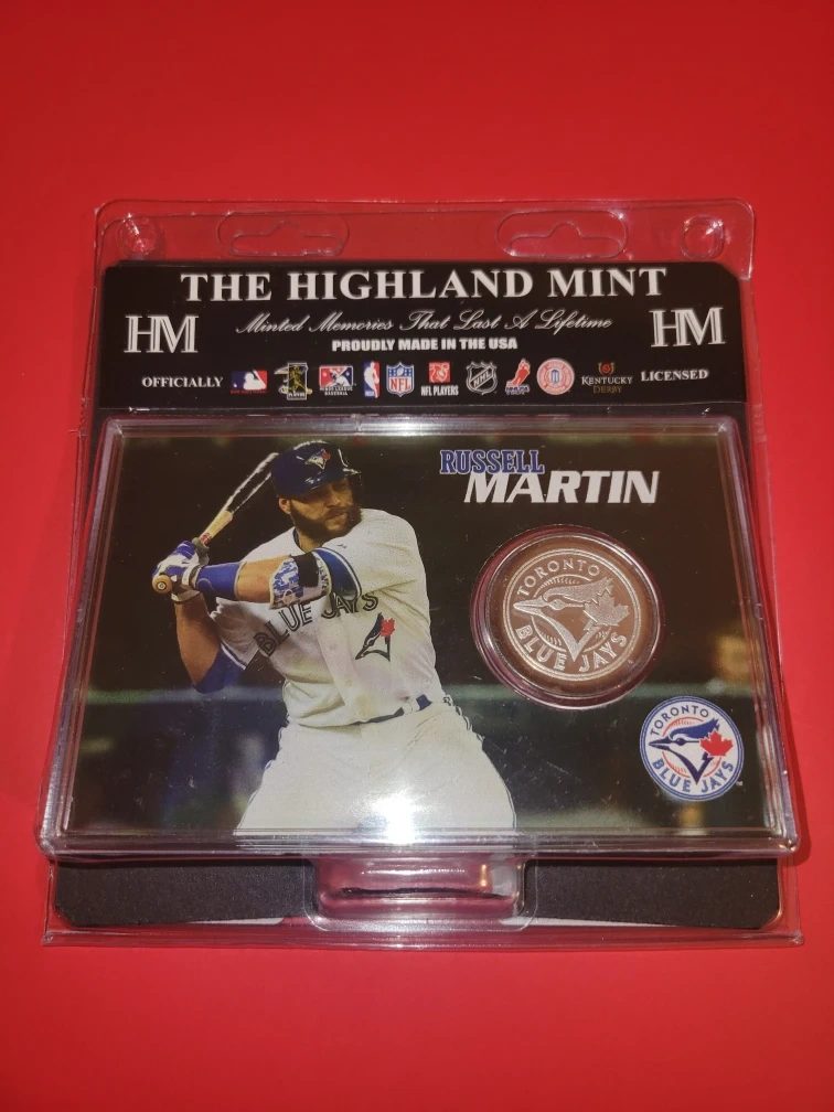 48Selling a Toronto Blue Jays Russell Martin coin from The Highland Mint! It's a 39mm silver-plated coin. Stand included.