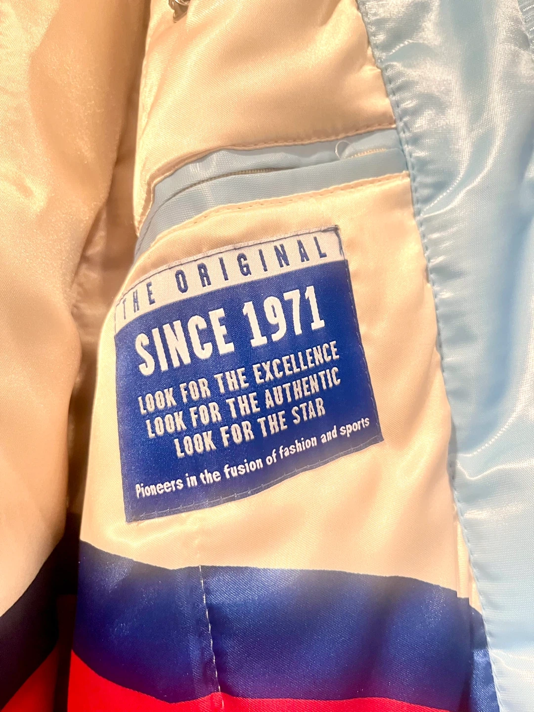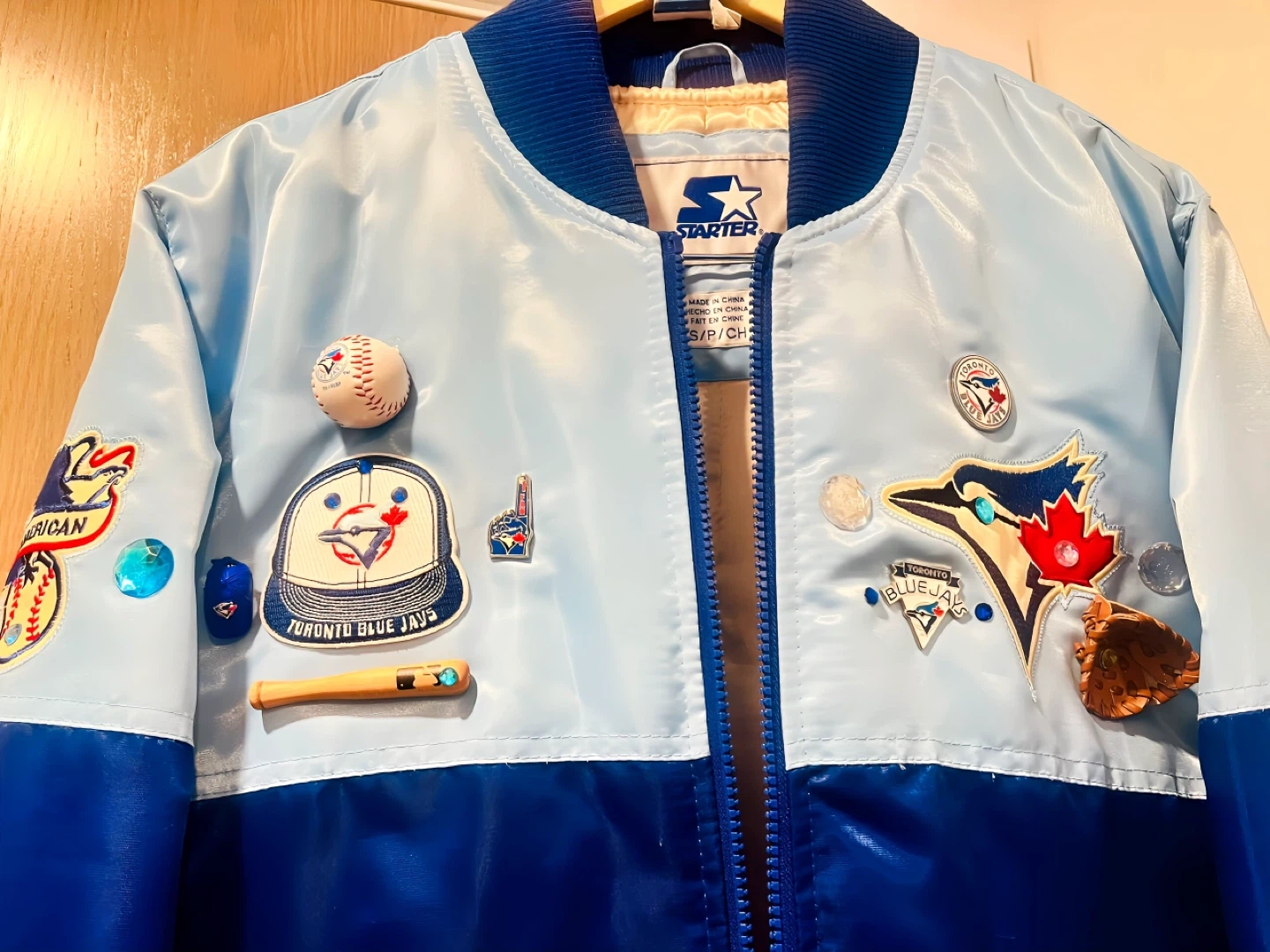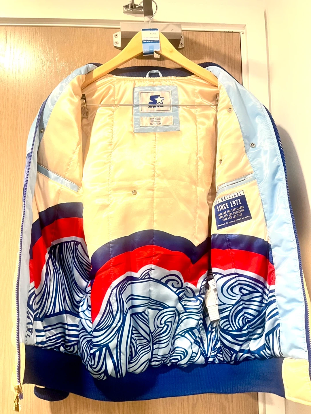 81Selling a Toronto Blue Jays bomber jacket by Starter! It's got a cool retro look with the team's colours and logos. Perfect for any Jays fan to show their support at the game or around town. Brand New Custom Made Toronto Blue Jays Jacket by Starter. Size: Small Material: Polyester Lining: Polyester Filler: Polyester Color: Tri-color fusion of blue & gold Collar: Rib-knit erect style Front: Full zipper closure Inner: Soft viscose lining Pockets: Two side storage welt pockets, two inner pockets Sleeves: Full-long Cuffs: Rib-Woven Style Rib-Woven Hem Fine quality Stitching Machine Wash Cold Delicate Cycle