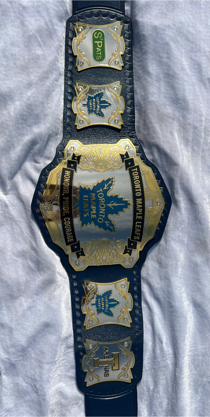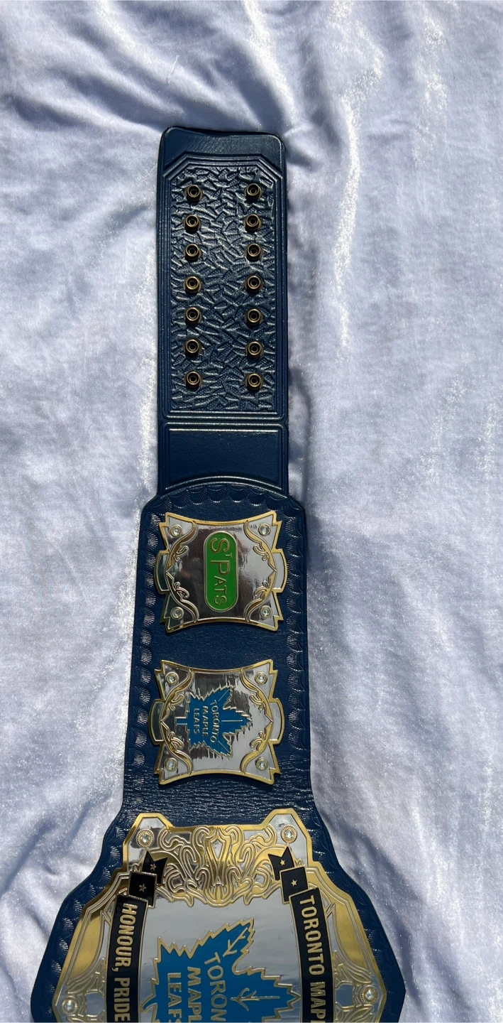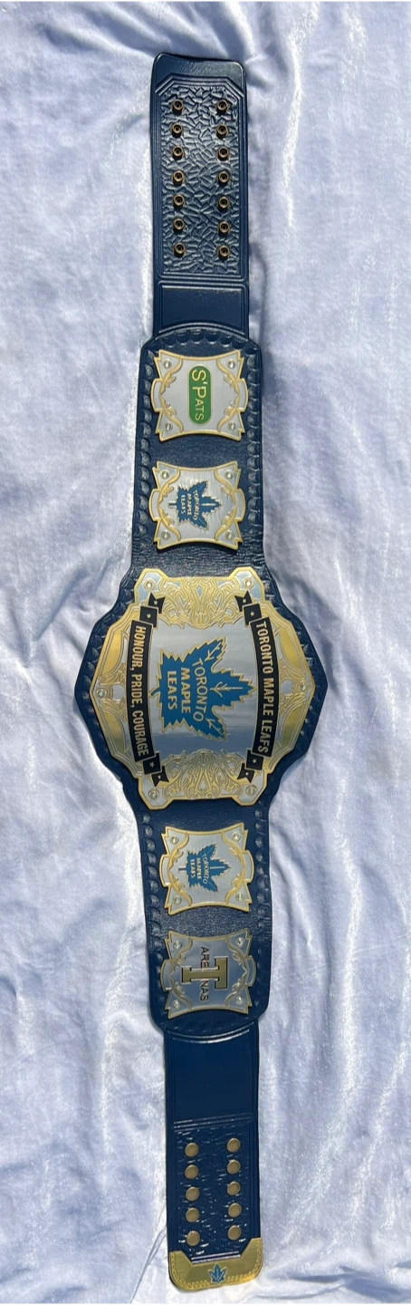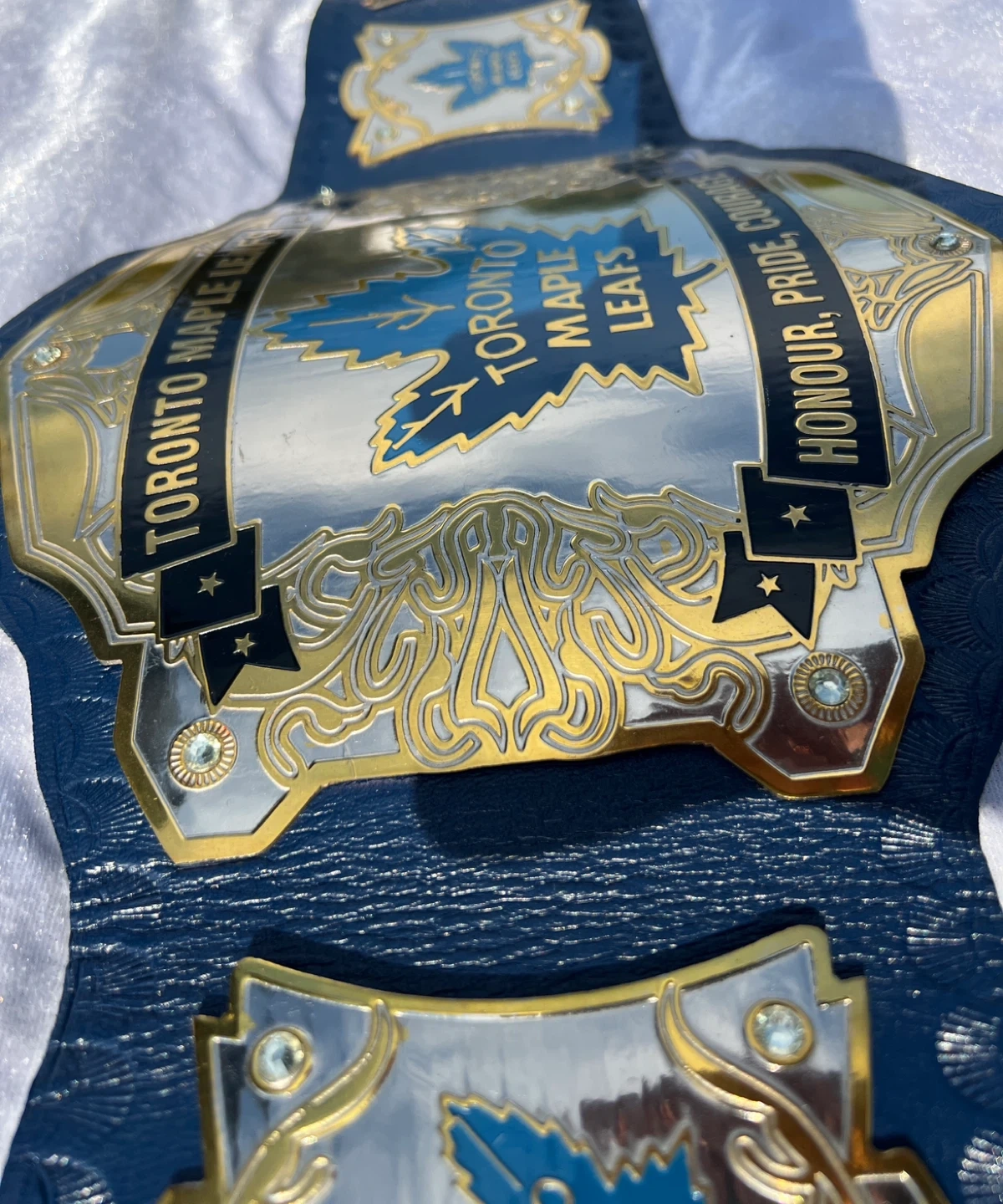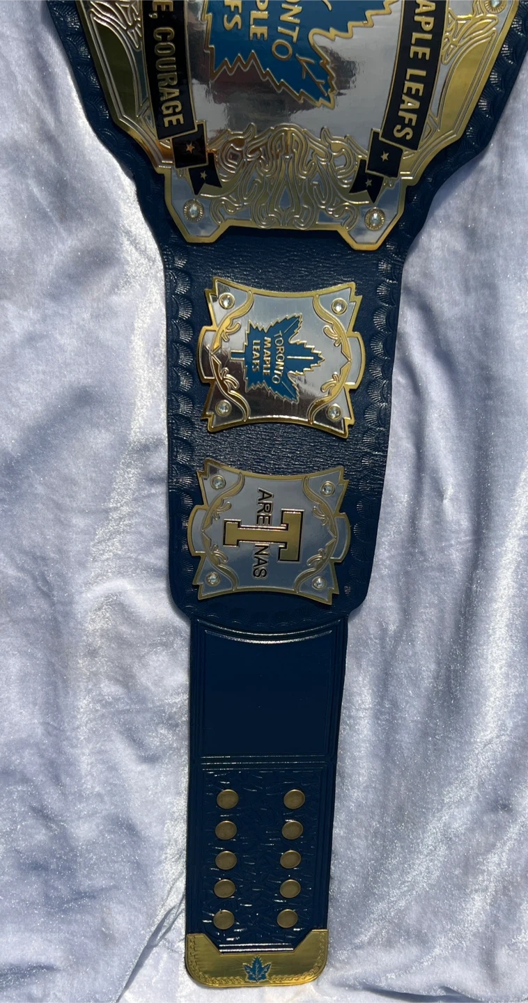 10Toronto Maple leafs Display wrestling Replica Belt Holding this title belt will make every moment feel like a victory." Strap Dimensions: 50" x 11" x 0.2" approx., Fits upto Waist Size: 46", Overall Length 50" Metal plates , Original leather authentic 100% Premium Quality Metal Snap Buttons, Snap closure Custom belts make on request only More info any question feel free to ask