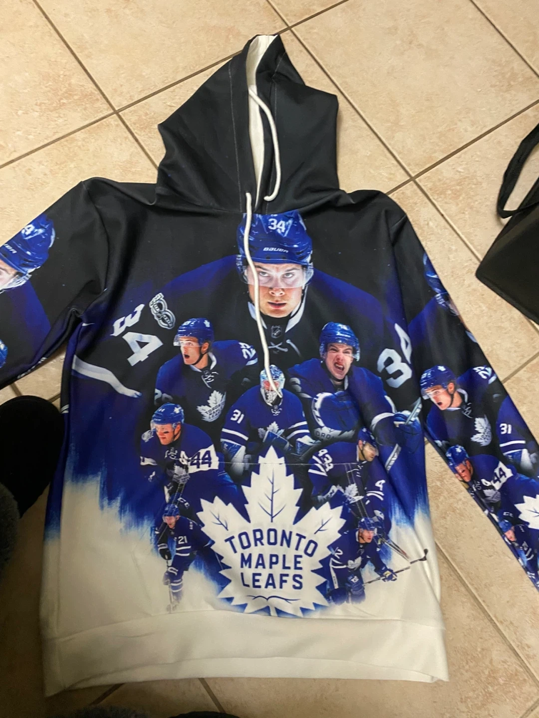 52Selling a Toronto Maple Leafs hockey hoodie. It features a design with various players and the team logo. Great for any Leafs fan!