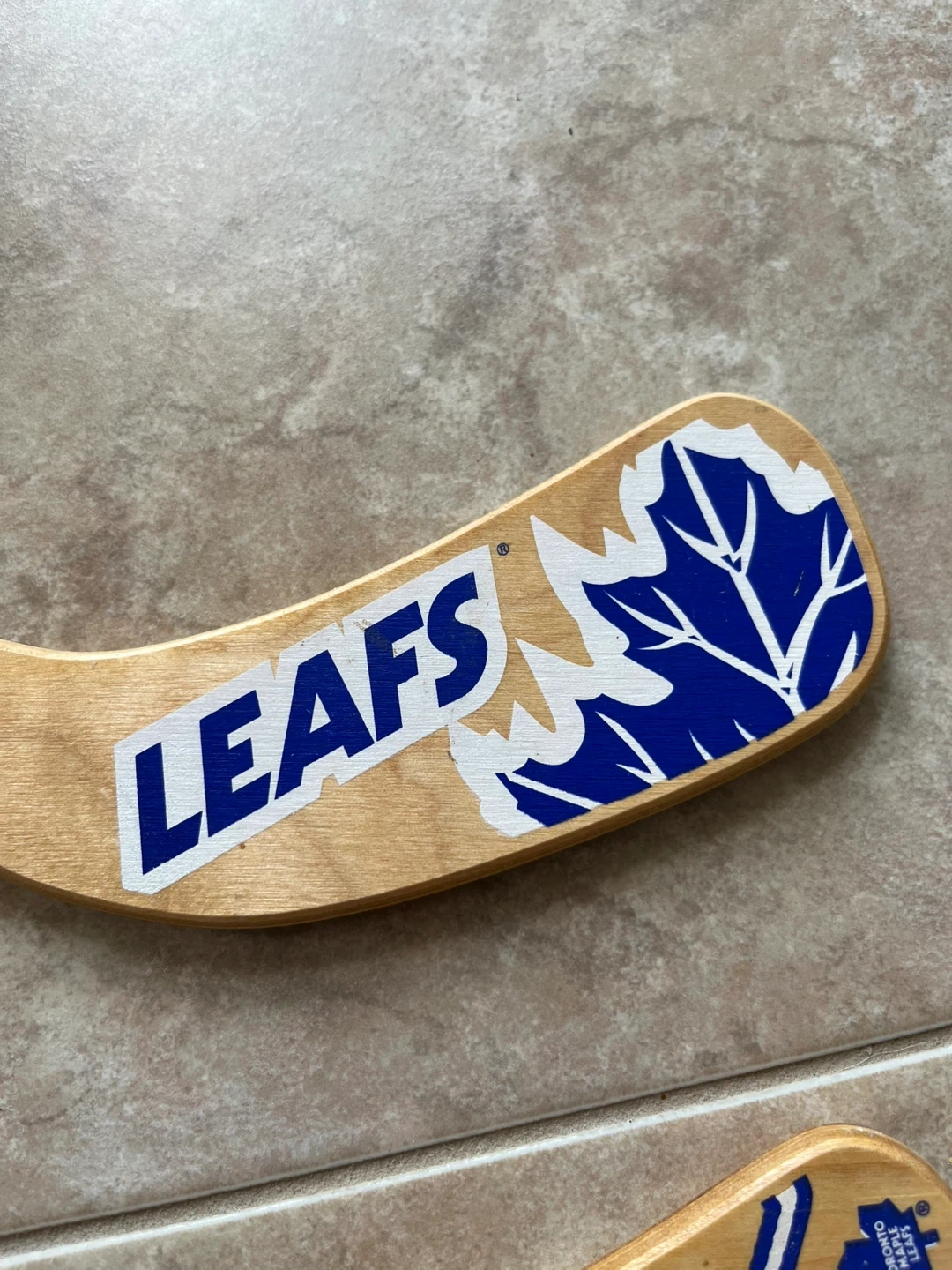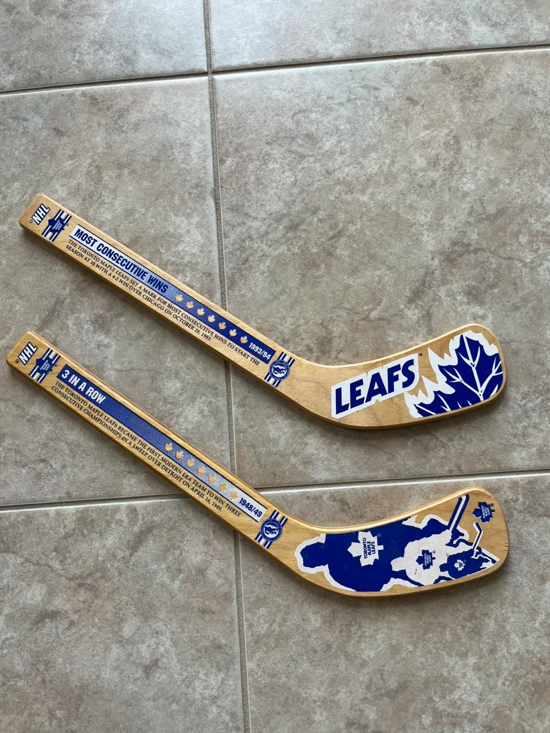 65Selling a pair of Toronto Maple Leafs mini hockey sticks. One commemorates the 'Most Consecutive Wins' in 1993/94, and the other celebrates '3 in a Row' from 1948/49. Great for any Leafs fan! Moving sale/ smoke free home