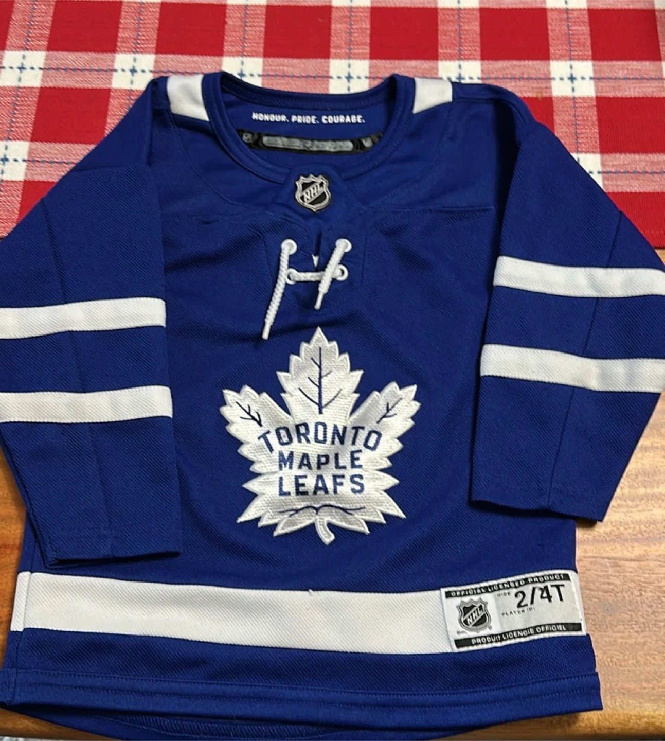 Selling a cute Toronto Maple Leafs NHL jersey in size 2/4T! The jersey is in great condition and features the classic Maple Leafs logo. Perfect for your little hockey fan!