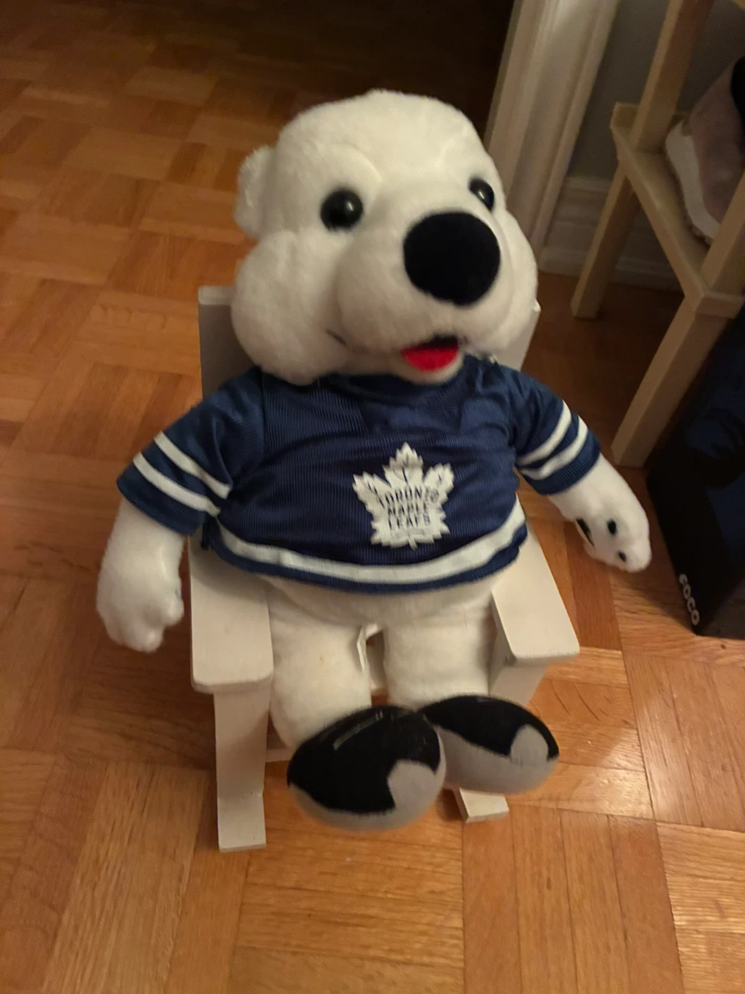 Selling a cute Toronto Maple Leafs plush Carlton the bear! It's wearing a Leafs jersey and sitting on a little white chair. Great for any Leafs fan!