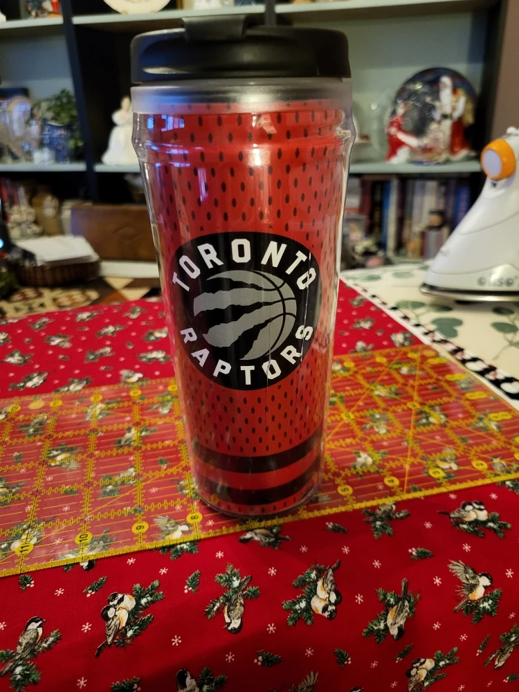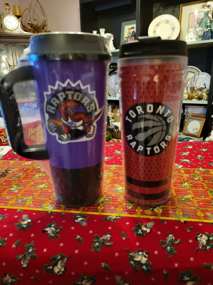 70Two brand new Toronto Raptors travel mugs! One is Vintage purple with a handle and fits in car holders, and the other is white and red with the " claw", insulated and also fits in car holders! Perfect for any Raptors fan!