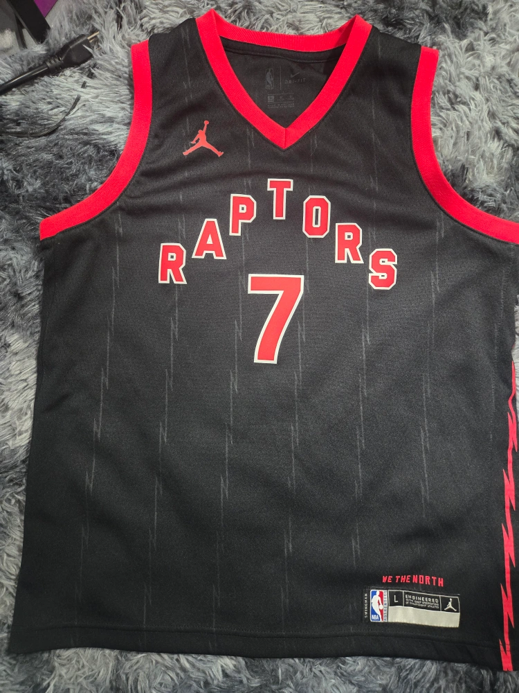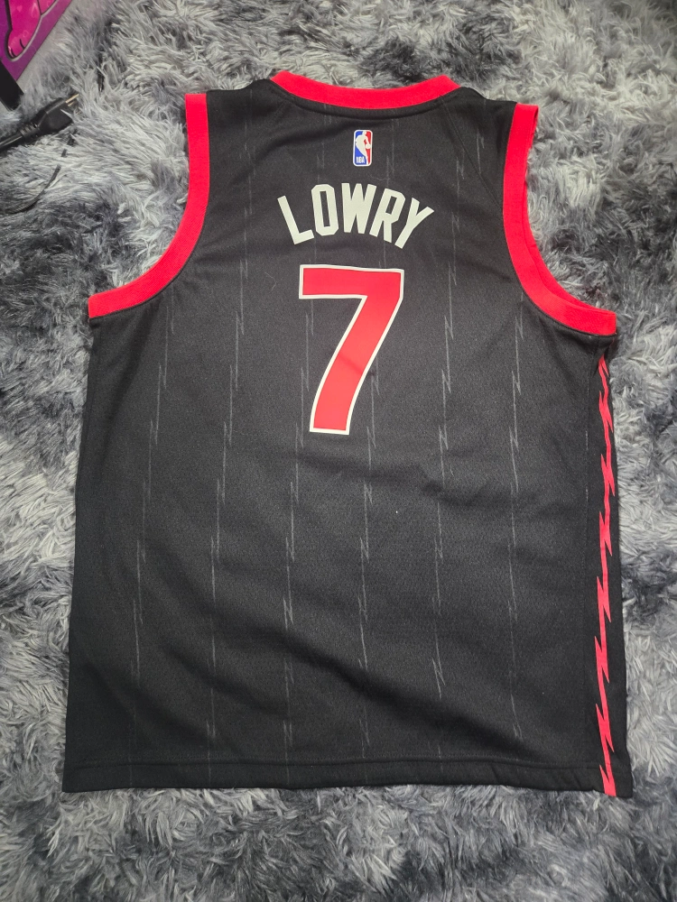 Selling a Toronto Raptors jersey with Lowry's number 7. It's a size small and in great condition! The jersey is black with red trim and features the Raptors logo and "We The North" detail at the bottom.
