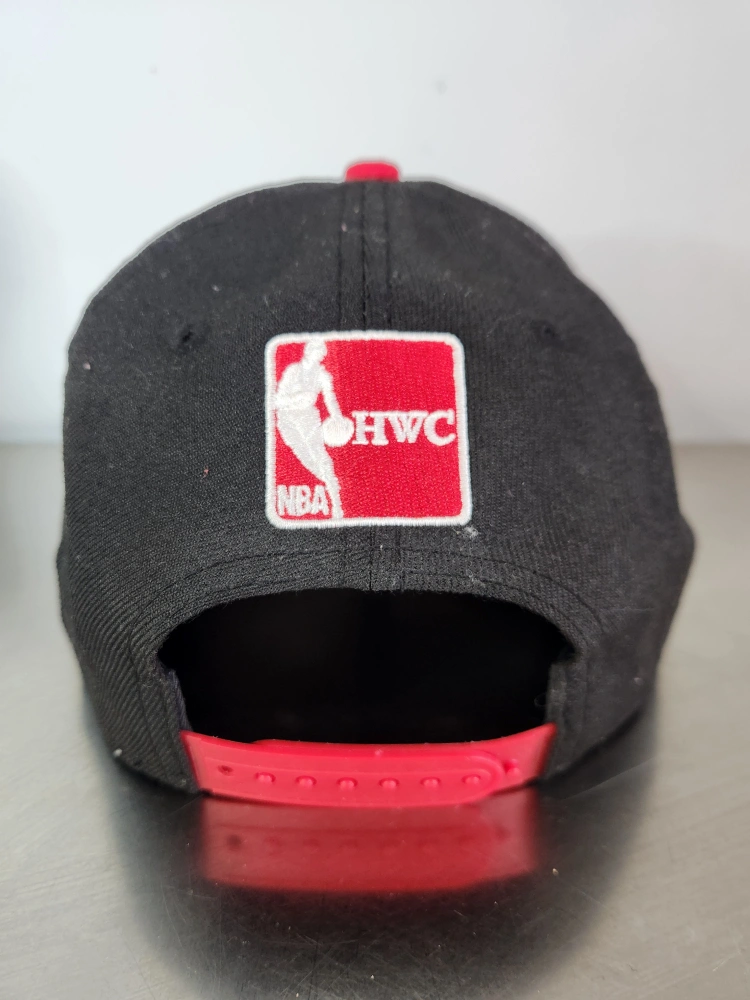 New Era fitted hat featuring a black crown with a red underbrim. The front features a purple and red embroidered Toronto Raptors logo. The back has a New Era logo and an NBA Hardwood Classics patch. Good condition.