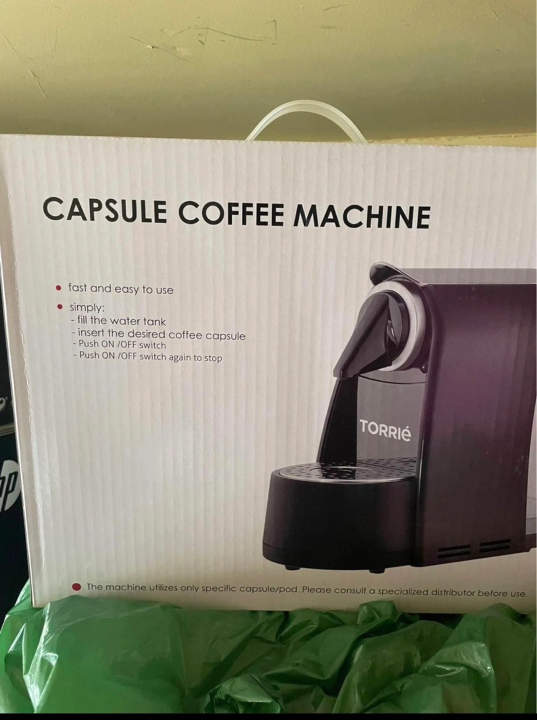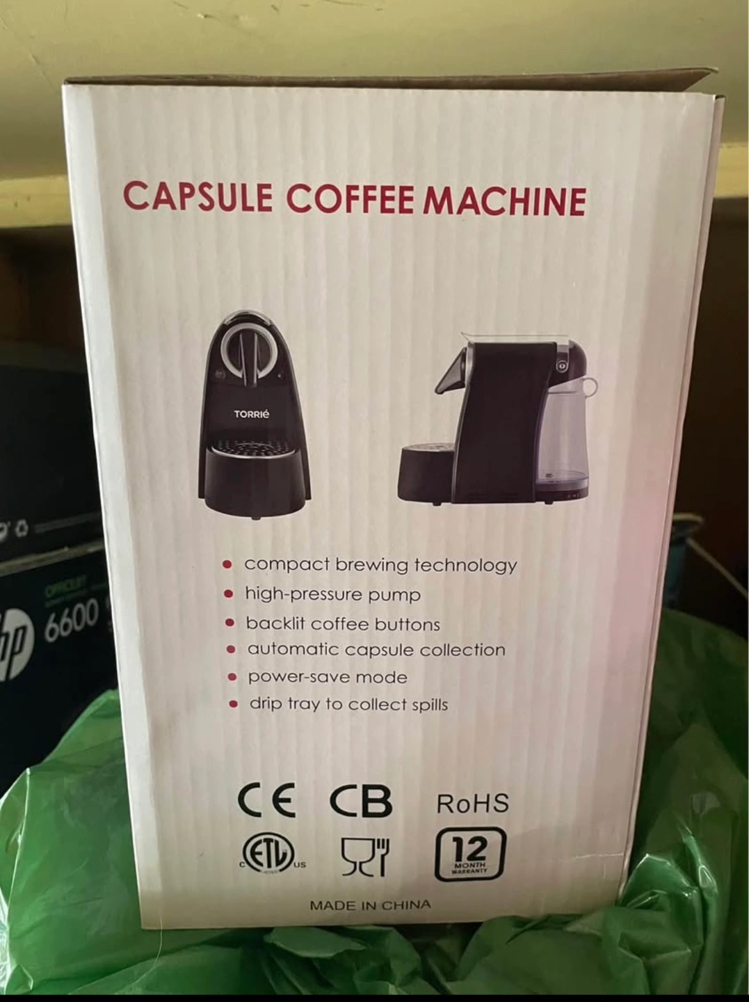 Black capsule coffee machine. Compact brewing technology, high-pressure pump, backlit buttons, automatic capsule collection, power-save mode, drip tray to collect spills. Brand new.