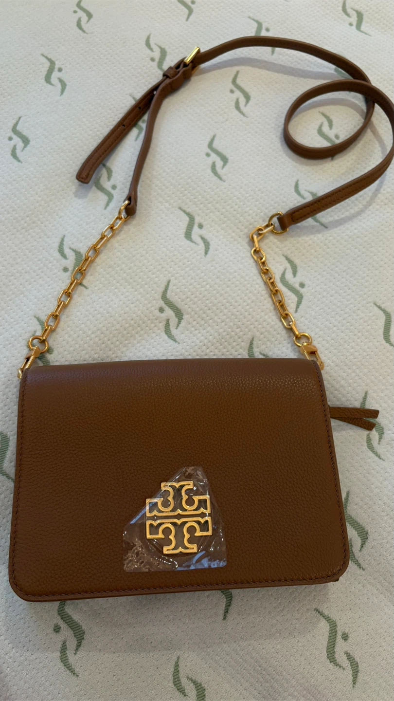 This is a cute Tory Burch crossbody bag in a lovely brown colour. It's perfect for keeping your essentials close while you're out and about. The bag features a gold-tone chain strap and the iconic Tory Burch logo. It's in great condition and ready for a new home!