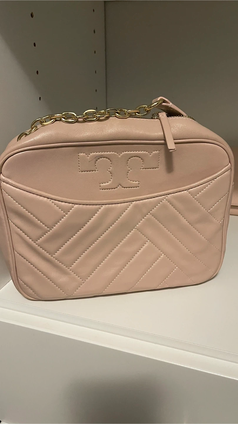 10Selling a Tory Burch camera bag in a lovely pink colour. The interior of this gorgeous bag is lined with fabric, secured by a zipper and the shoulder strap attached allows for crossbody wear. It's in good condition and has a stylish quilted design. Perfect for everyday use! Length- 25 cm Width- 6.5 cm Height- 18.5 cm Hardware - Gold Tone Shoulder Strap- 55 cm adjustable