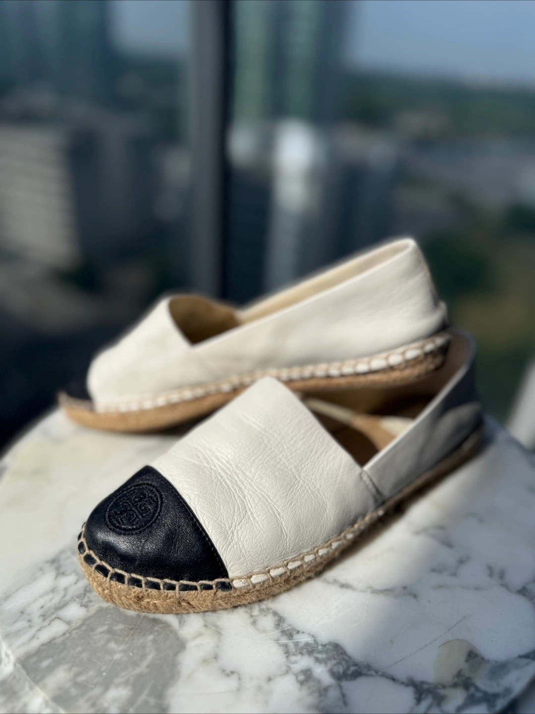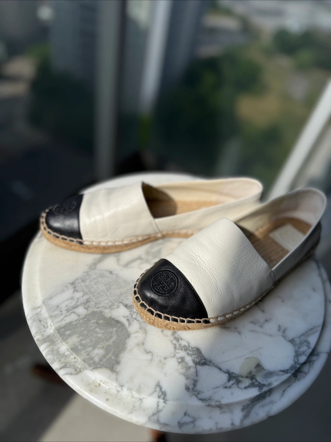 336Selling a pair of Tory Burch espadrille slip-on shoes in size 8. They are in great condition and feature a stylish black and white design. Perfect for summer and spring !