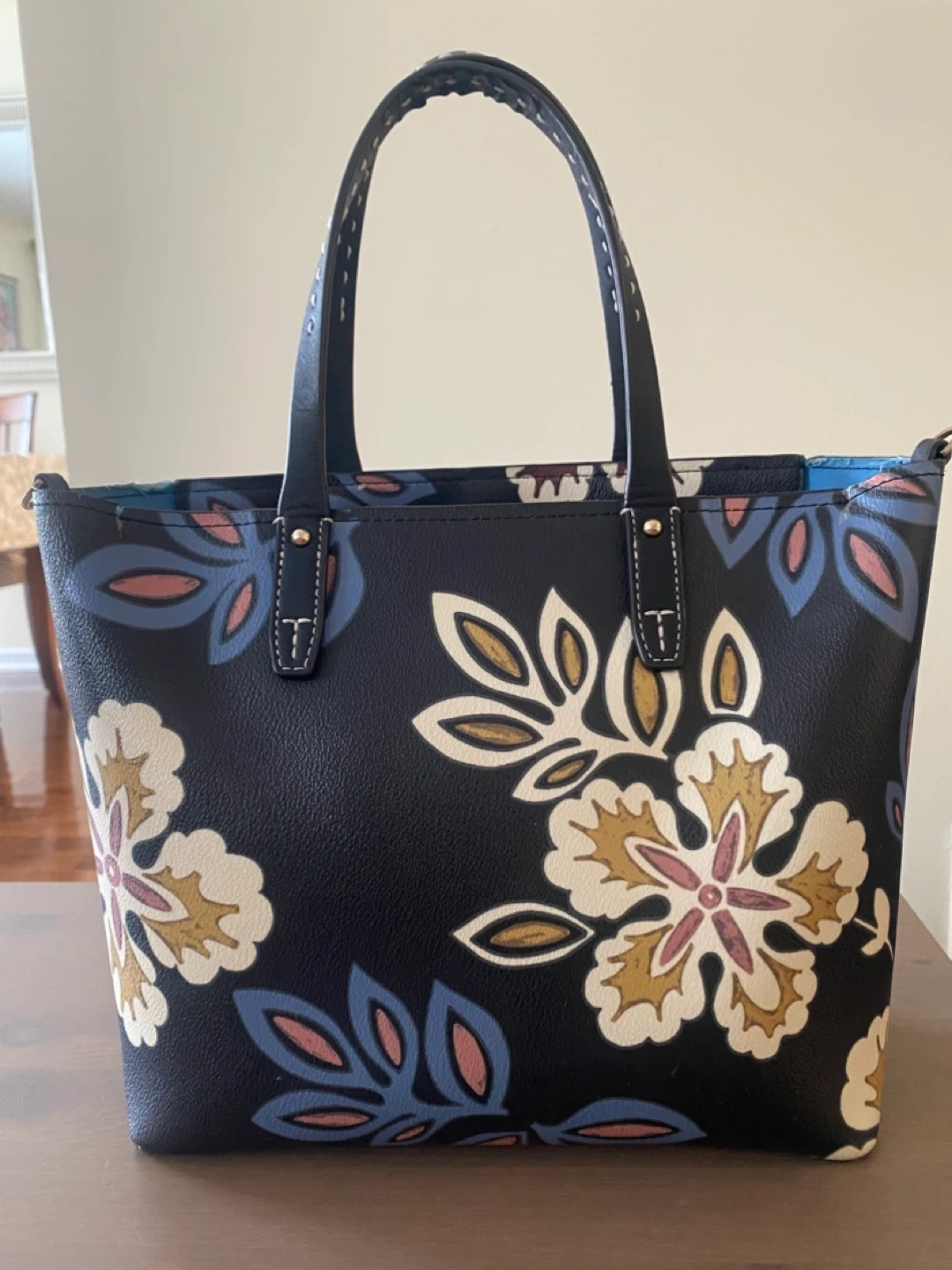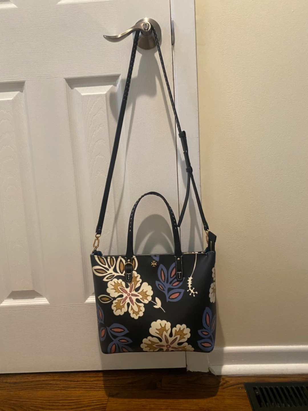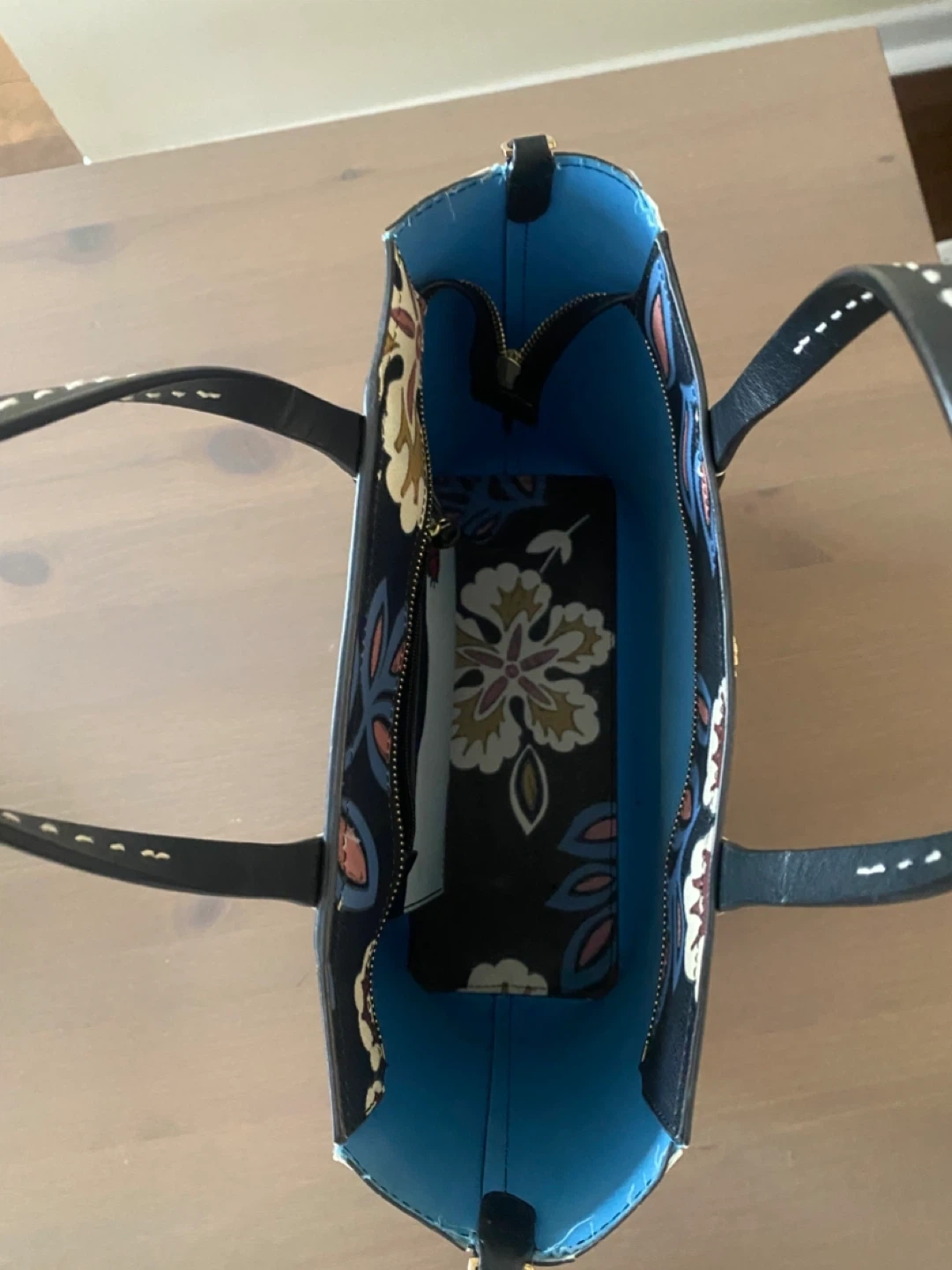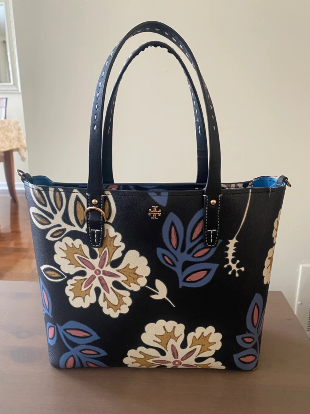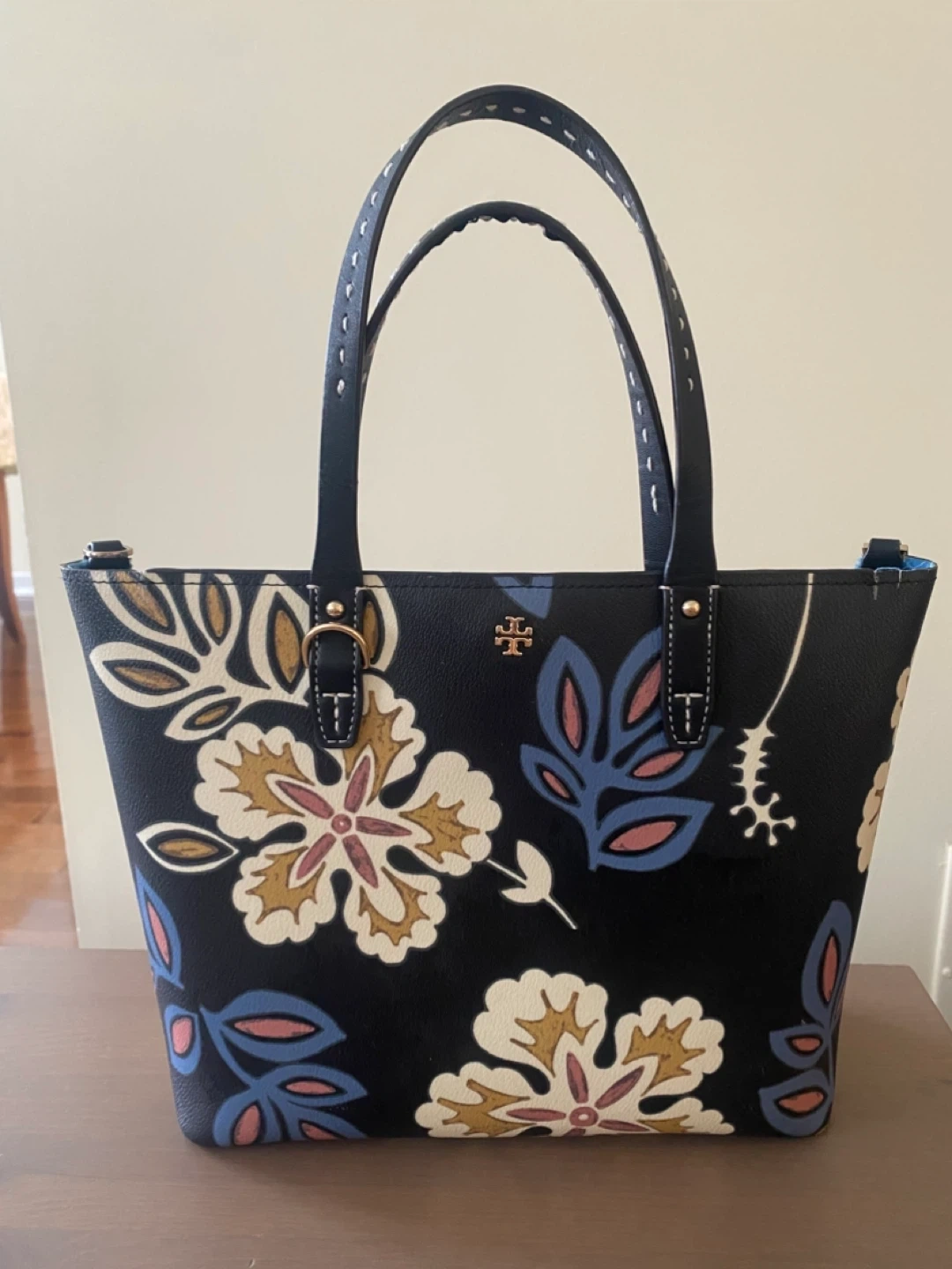 Selling a lovely Tory Burch tote bag in a beautiful floral design! It's in great condition and perfect for everyday use. The interior has a nice blue lining and a zippered pocket for your valuables. It's a stylish and practical bag!