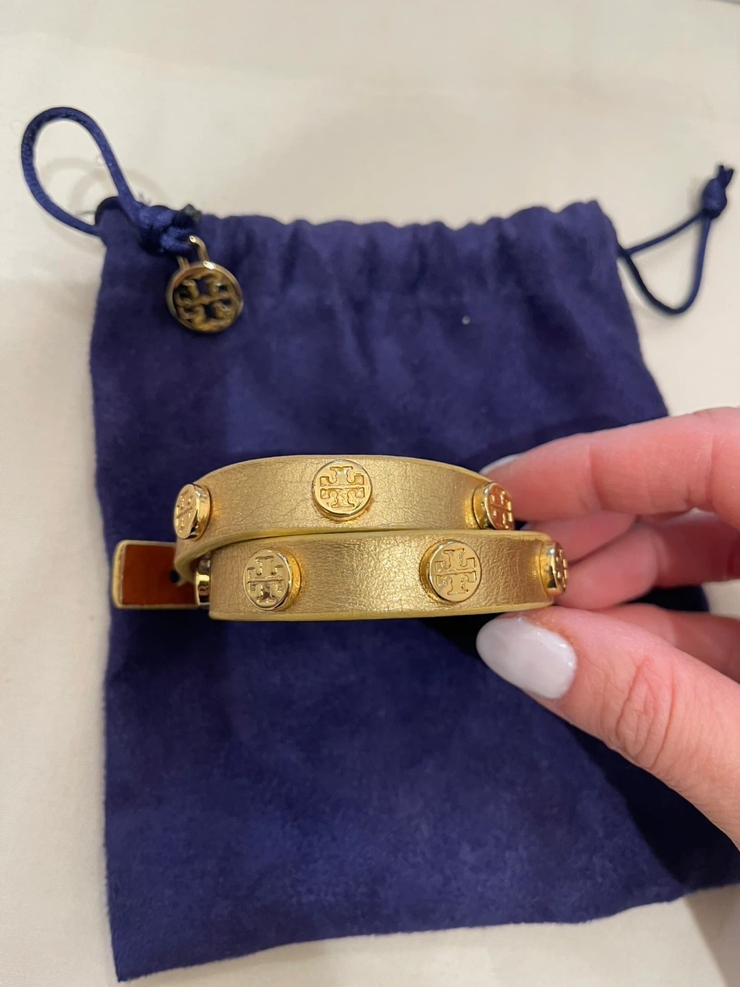 28This is a lovely Tory Burch gold leather wrap bracelet. It features the Tory Burch logo on the gold leather. Comes with the original pouch!