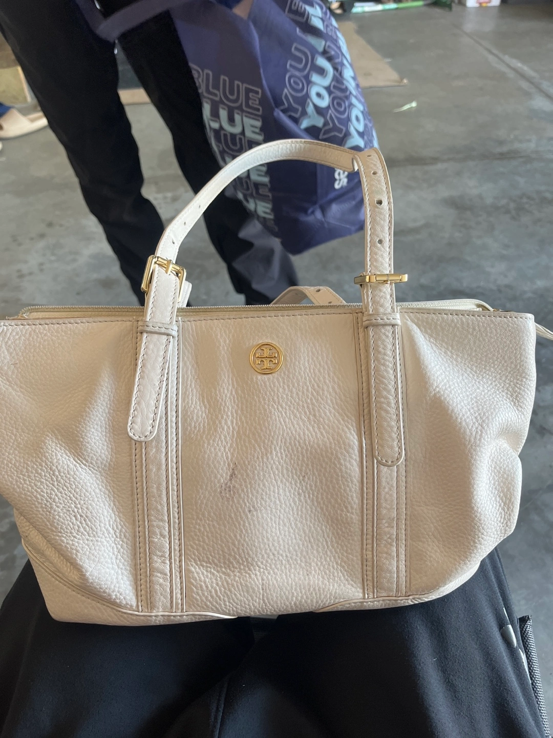 Off-white coloured handbag. Features a handle and zipper closure. It has a small gold logo. You can use this bag to carry around your important belongings and help you stay organized.