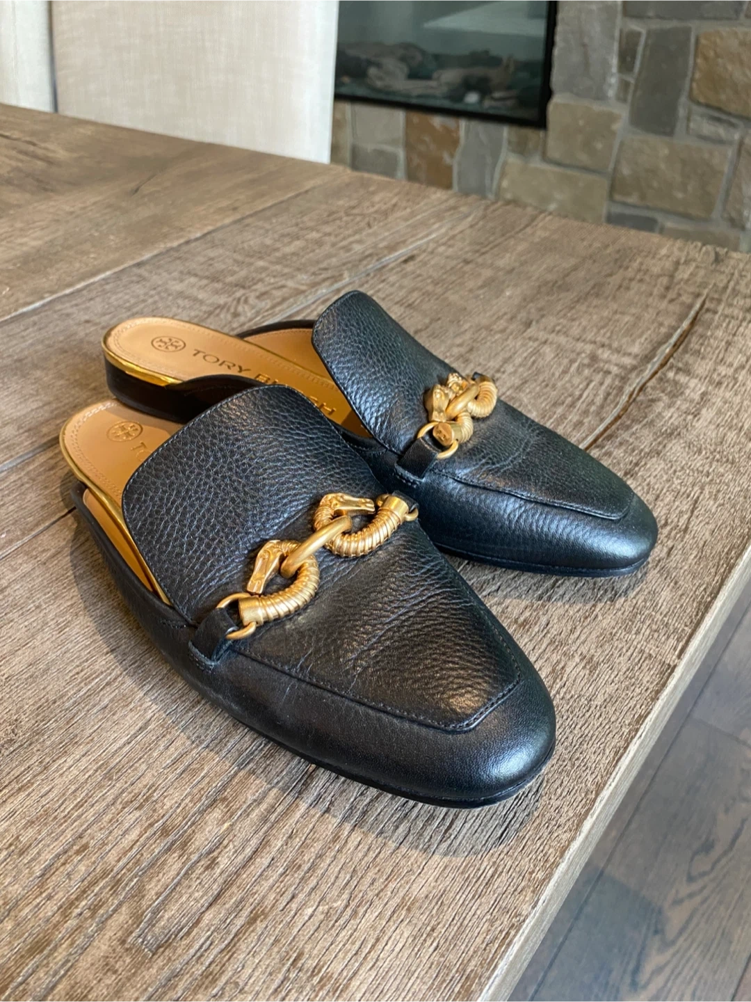 15Selling a pair of Tory Burch mules in size 8.5M. They're black leather with gold detailing. Perfect for adding a touch of elegance to any outfit!