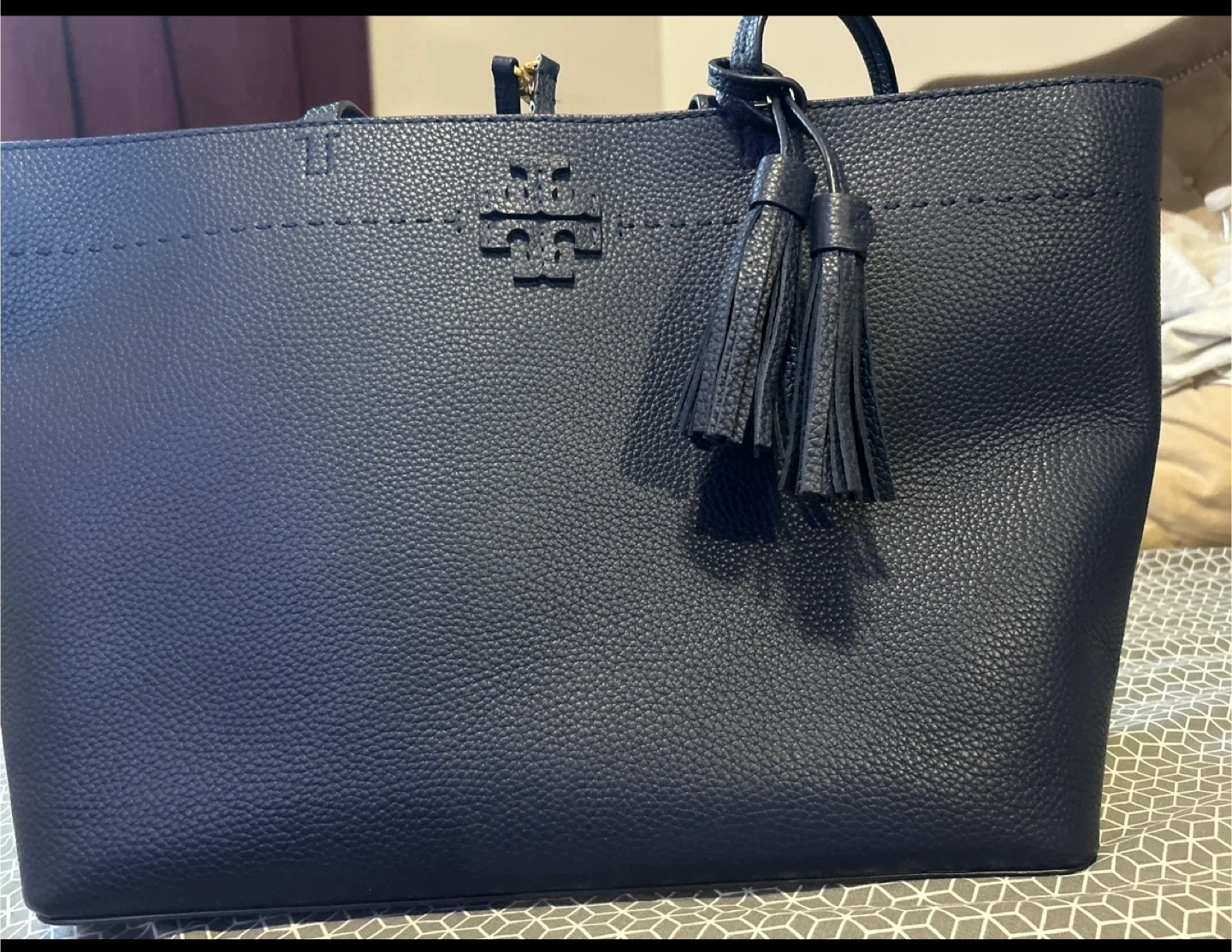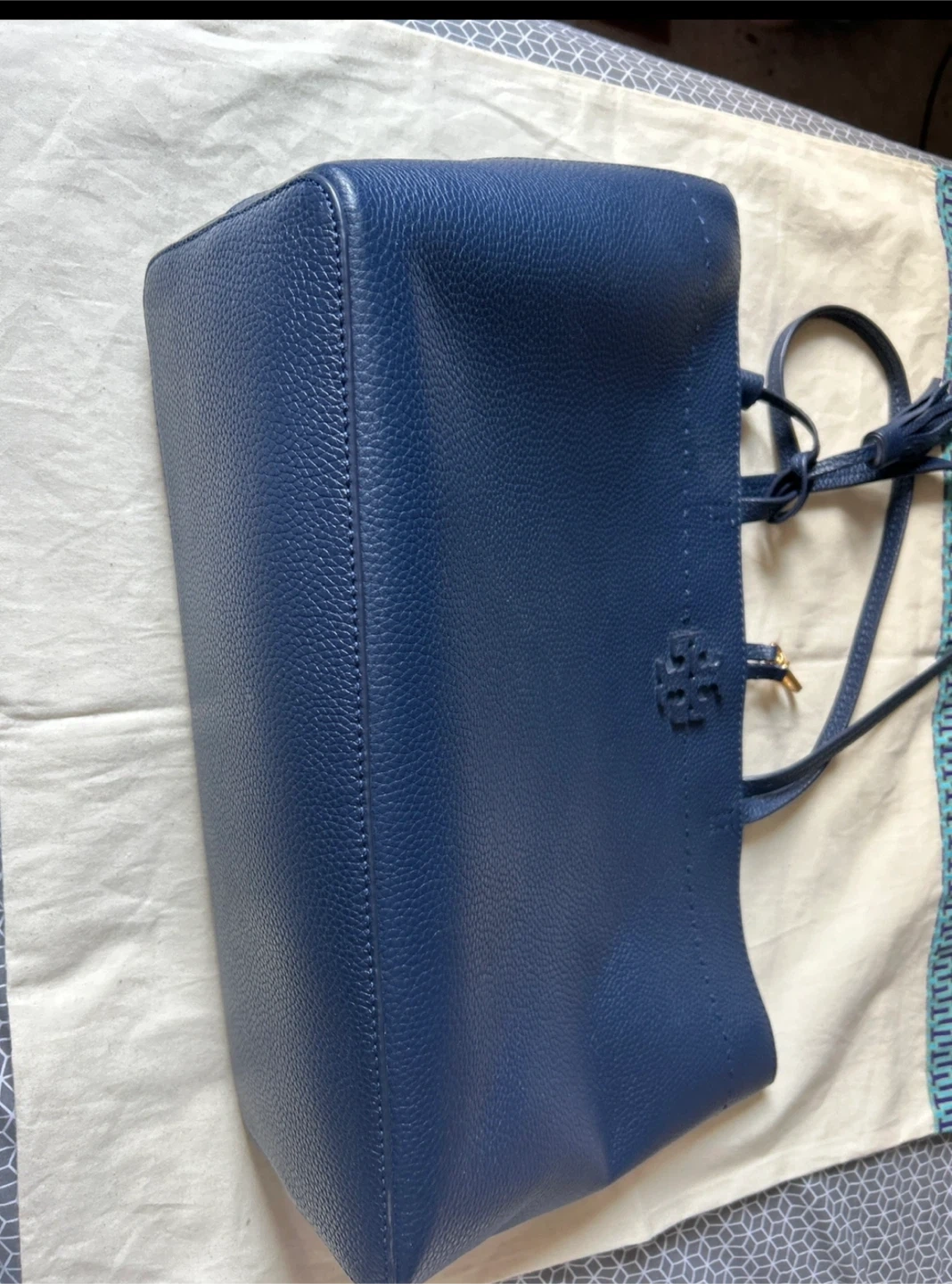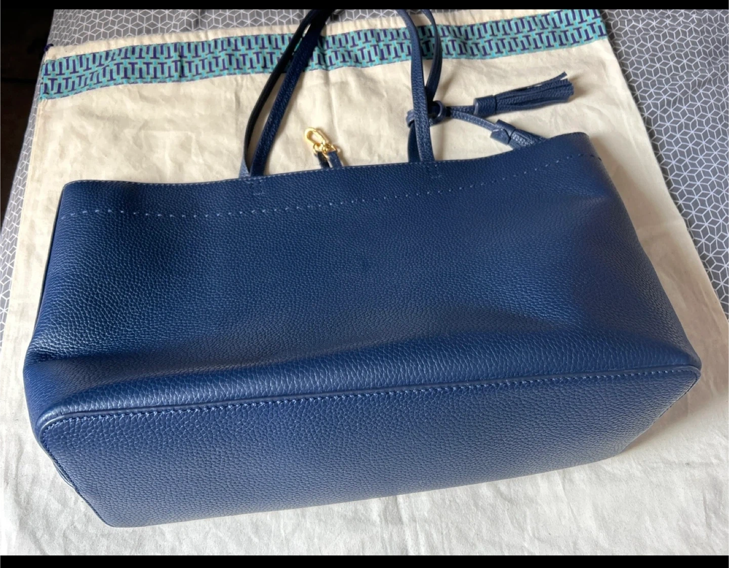 This is a lovely Tory Burch tote bag in a beautiful shade of blue. It's made of leather and features a stylish design with tassels. Perfect for everyday use! Excellent condition, clean , no tear and wear, comes with a dust bag.