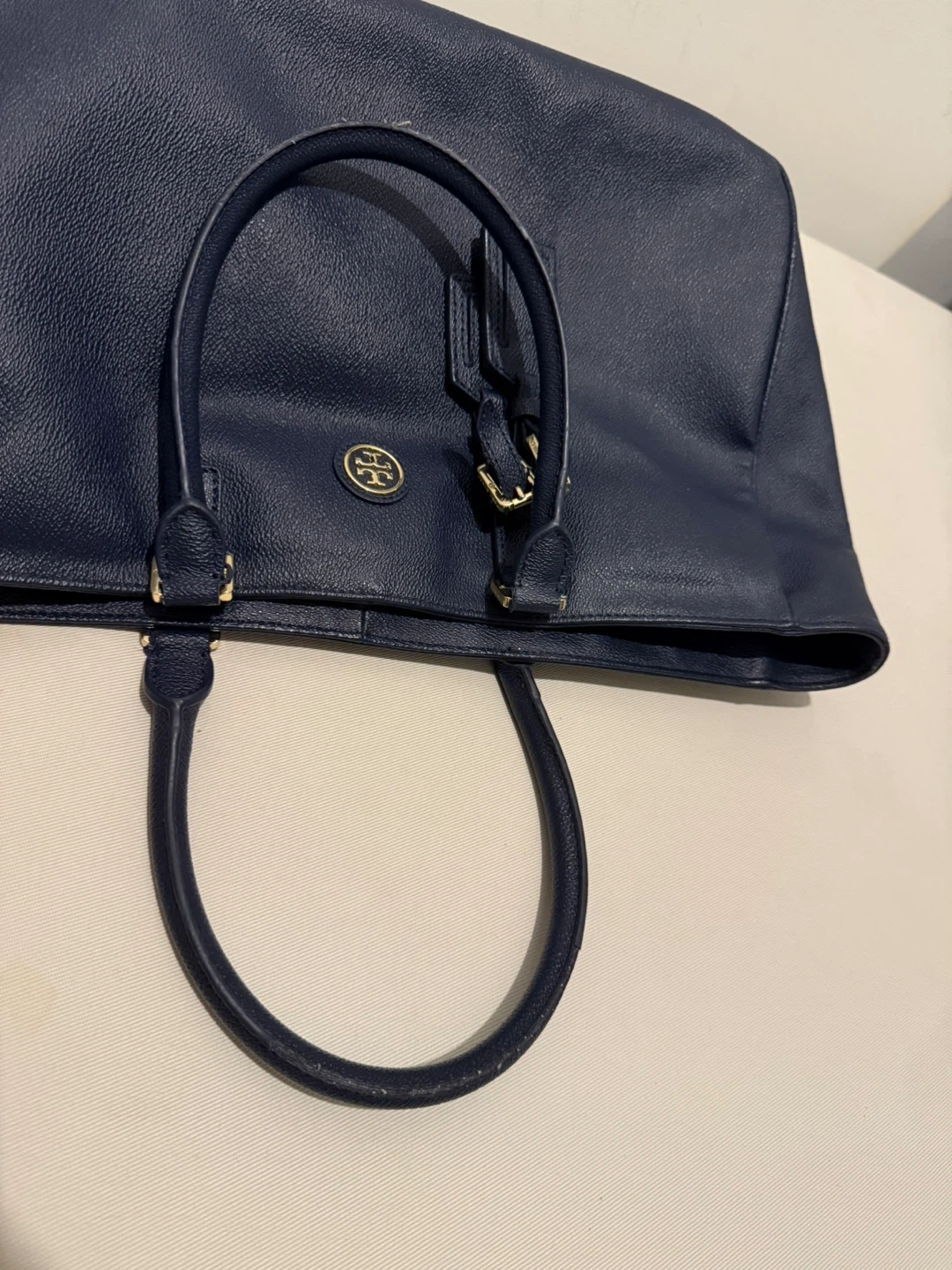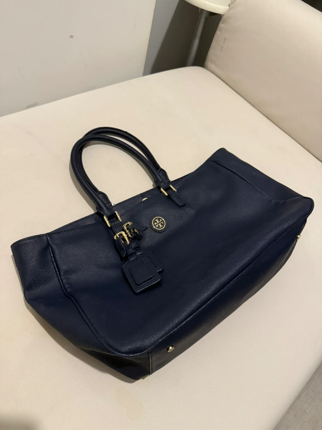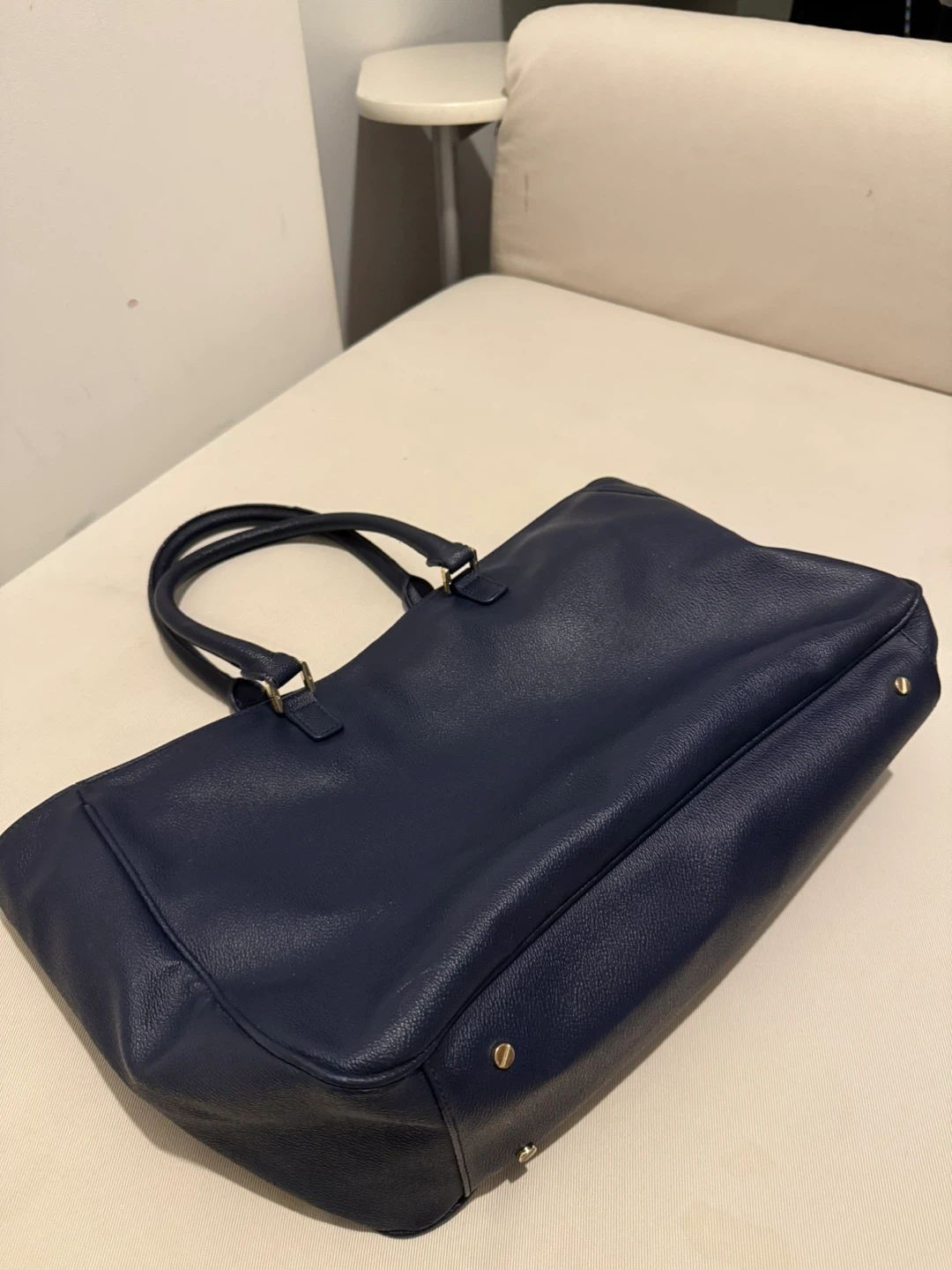 This is a lovely Tory Burch tote bag in a beautiful navy colour. It's perfect for business and semi-business occasions. There are some flaws as shown in pictures, reflected on price. It's in good condition and ready for a new home!