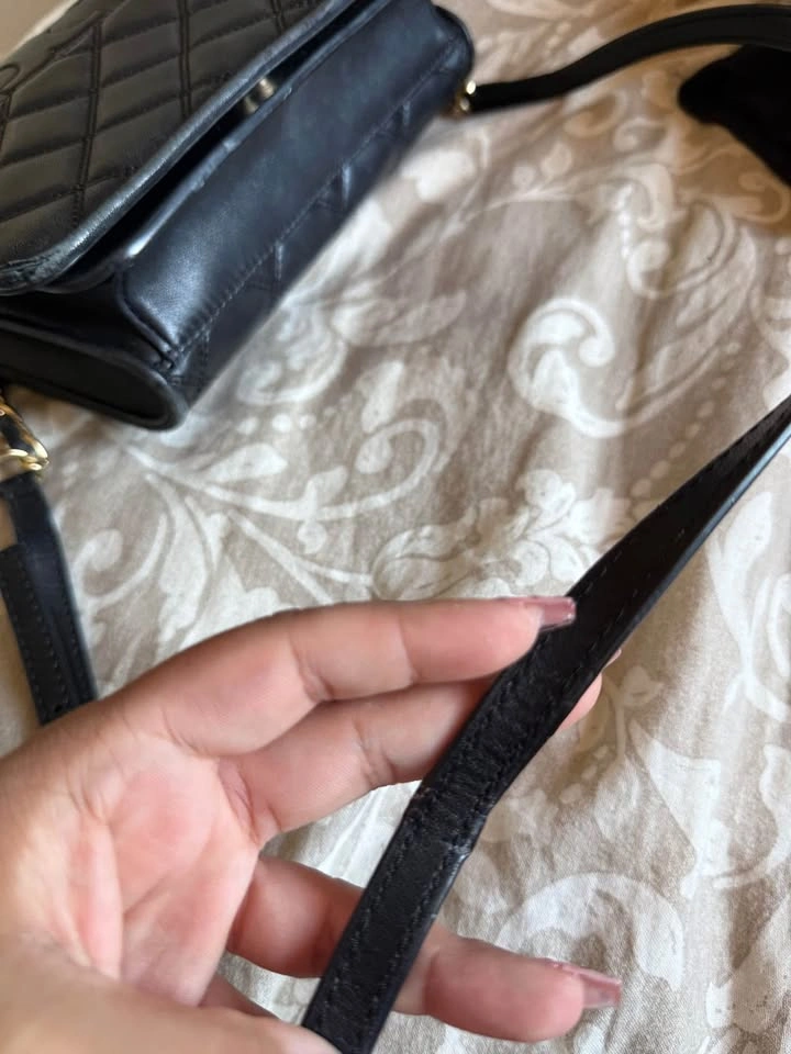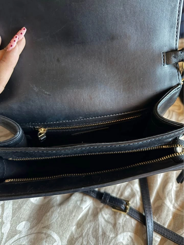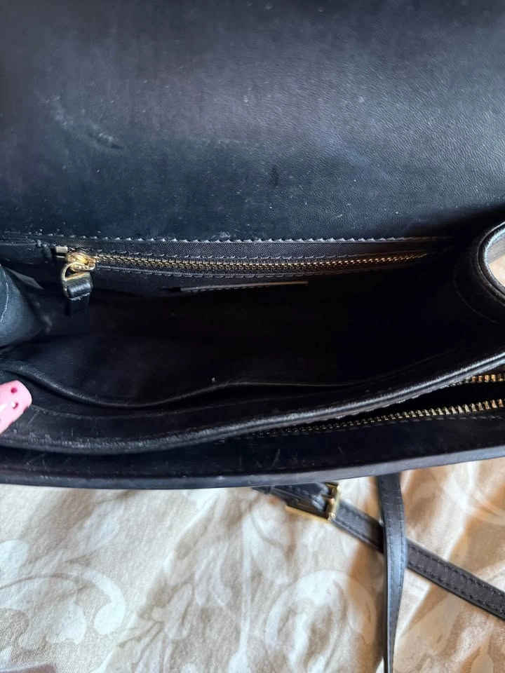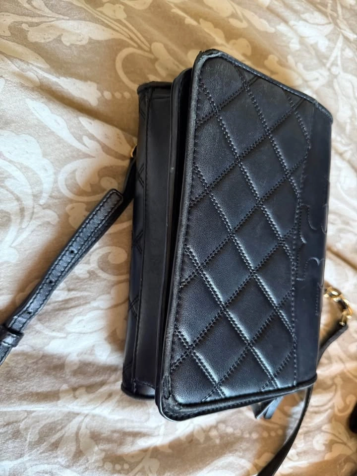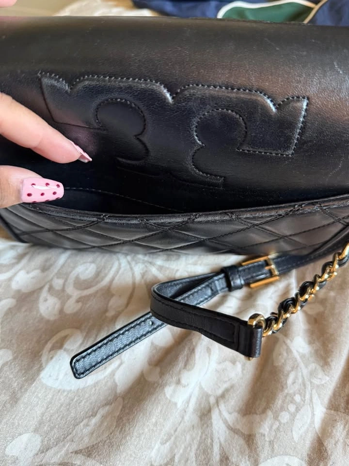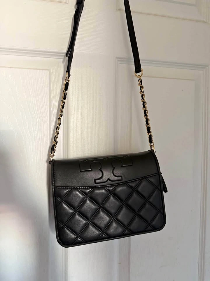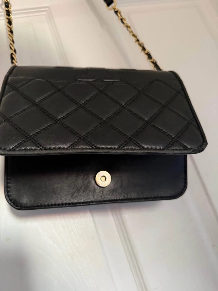 Authentic Tory Burch quilted leather crossbody/shoulder bag in classic black with gold chain detail. Originally purchased for $300 plus tax. Gently used for a couple of years, then stored. There is some visible wear and creasing, especially on the corners and interior lining (see photos), but overall the bag is still stylish and fully functional. All zippers and magnetic closures work perfectly. - natural smooth leather - Magnetic snap fastening - 1 back slip pocket - Lined interior - 1 inner zip compartment - 1 inner slip pocket - 1 inner zip pocket - Adjustable shoulder strap - Dimensions: L8.5 in x H6 in x W3.5 in
