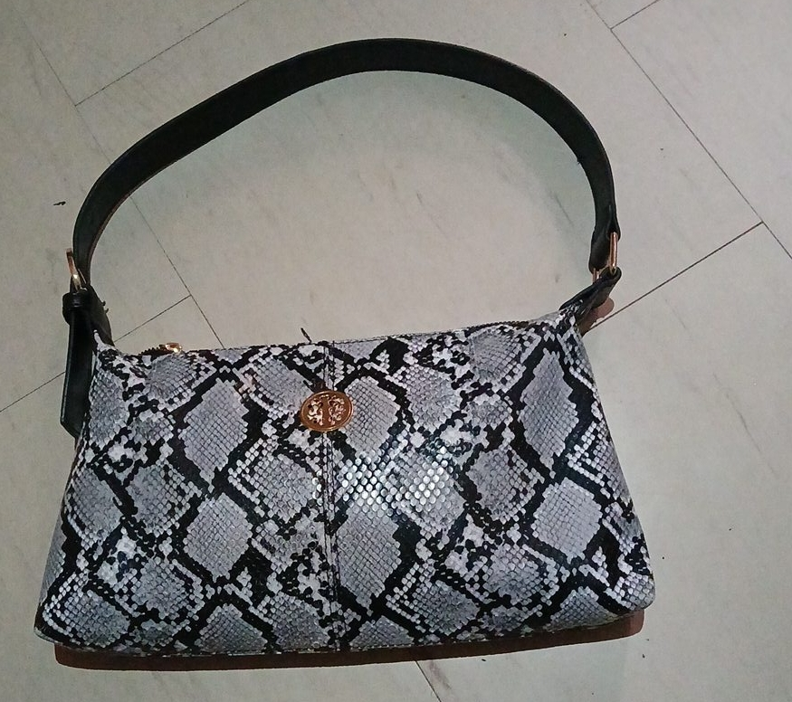 Stylish Tory Burch shoulder bag with a snakeskin print! This bag is in great condition and features a sleek black handle. Perfect for adding a touch of sophistication to any outfit