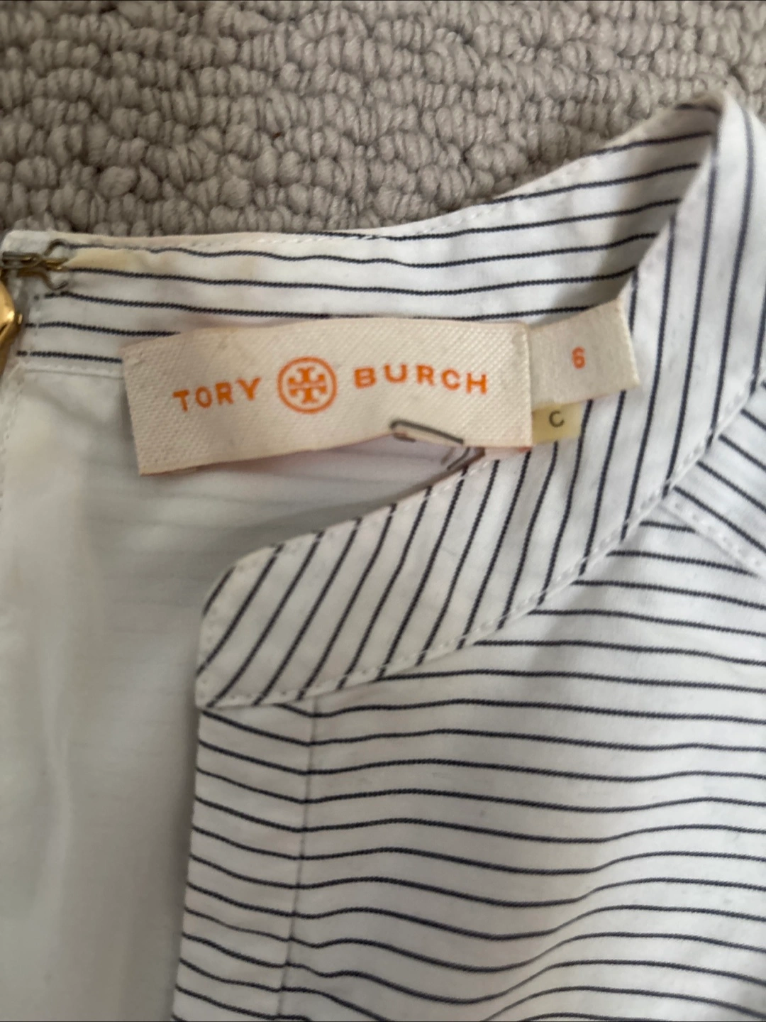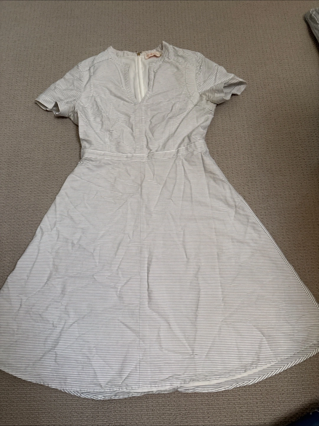 A gorgeous dress. It features a V-neckline, short sleeves, and a fitted bodice. The dress has a subtle striped pattern, and an A-line skirt. Perfect for a leisurely stroll through the park, this dress is sure to bring you peace.