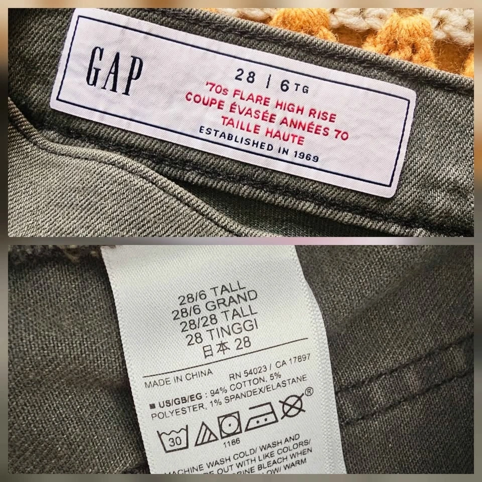 Jeans are made with a muted olive green stretch denim, with 2 front and 2 back patch pockets and a zipper fly closure. Made to the Gap's Washwell eco-friendly standard, in a socially responsible factory. Fabric is 94% cotton, 5% polyester, and 1% spandex/ elastane.