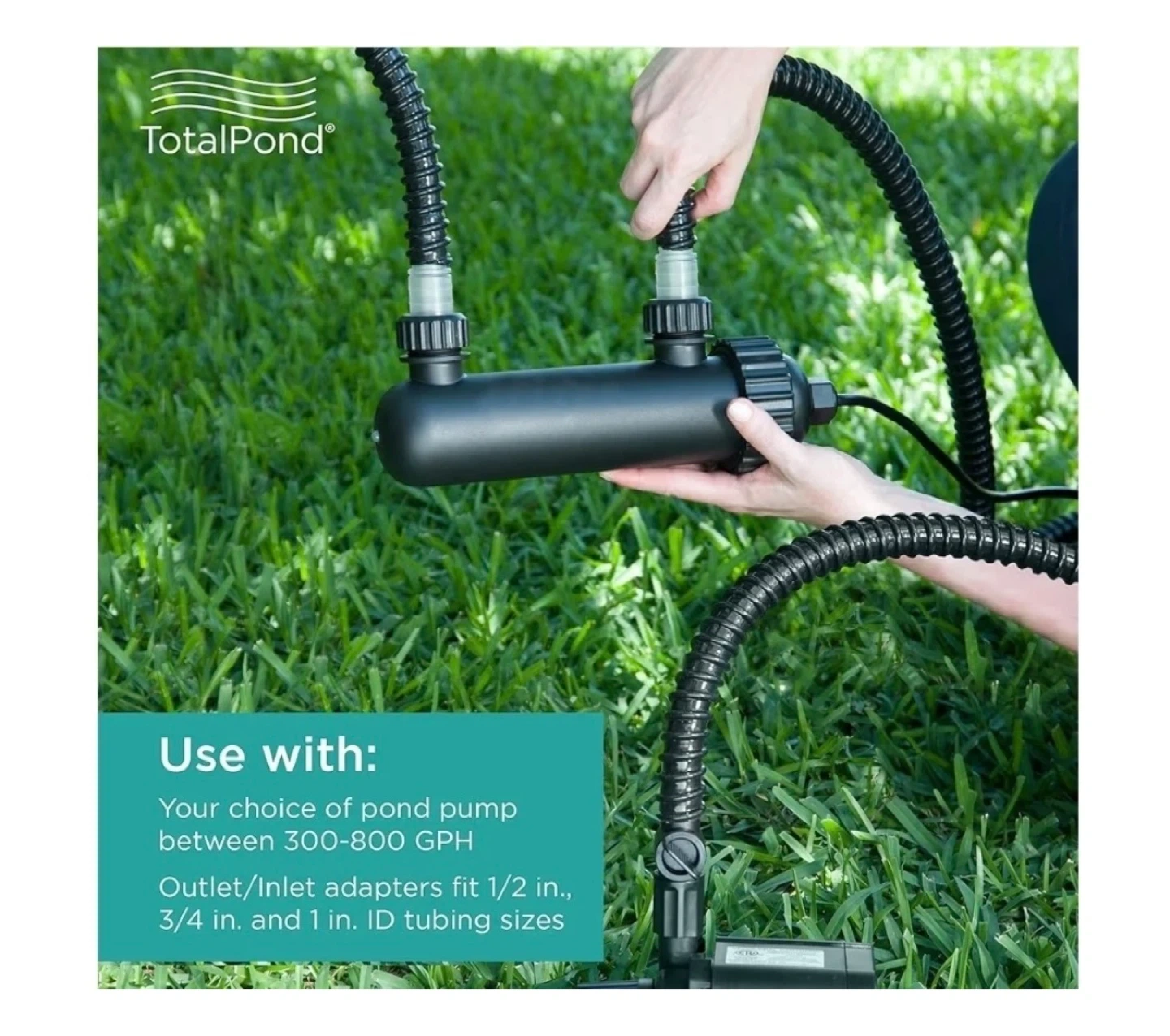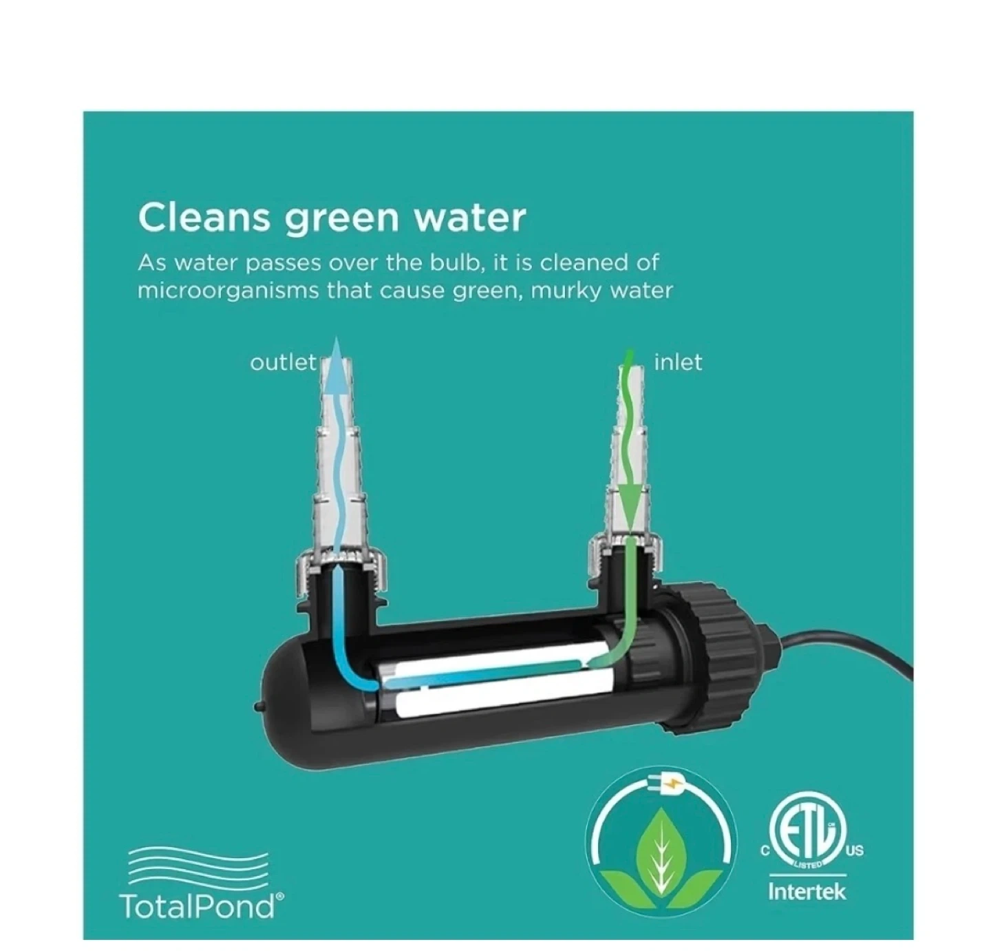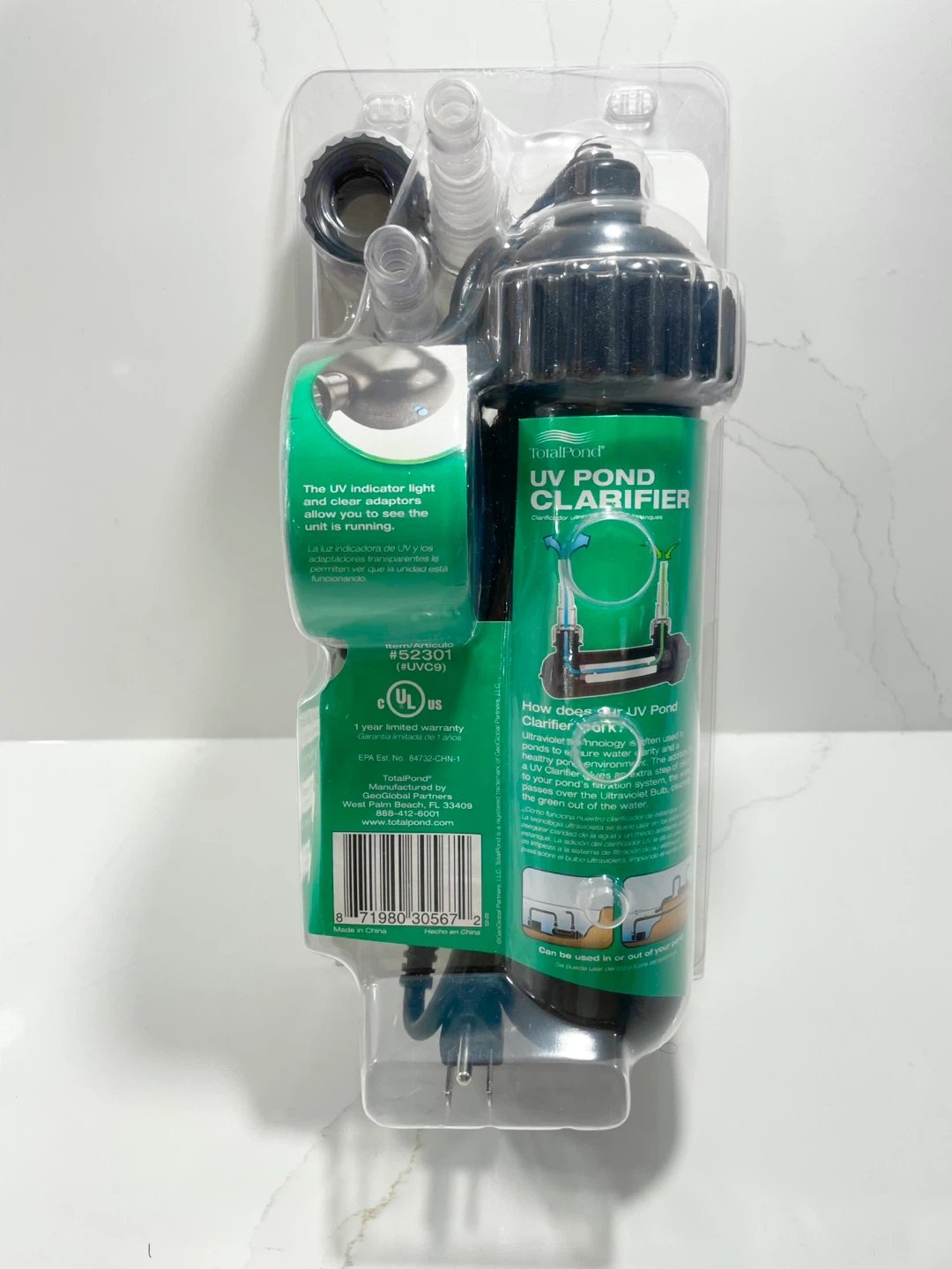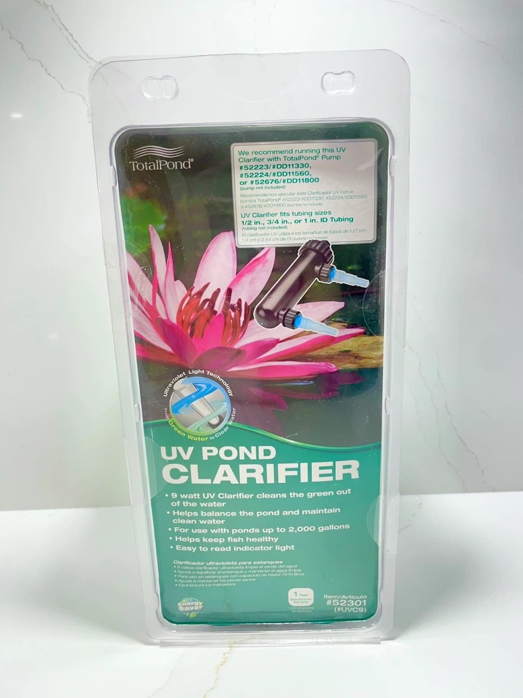 133Keep your pond crystal clear with this Total Pond 9W UV Clarifier, designed to sterilize water and eliminate green water using light bulb technology, ensuring a clean and fresh aquatic environment, it is new in box. $100 Model 52301 Key Features: * 9-watt UV clarifier * Cleans green water * Helps balance the pond and maintain water clarity * For use with ponds up to 2,000 gallons * Helps keep the heater clean * Easy-to-read indicator light
