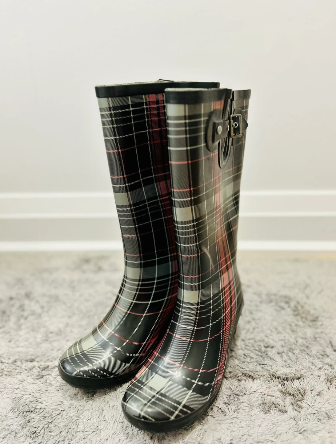 Keep your feet dry and stylish with these Totes rain boots! They feature a classic plaid pattern in black, grey, and pink. These boots are a women's size 7 and are in great condition, ready to take on rainy days. $40 OBO Pick up Thorold
