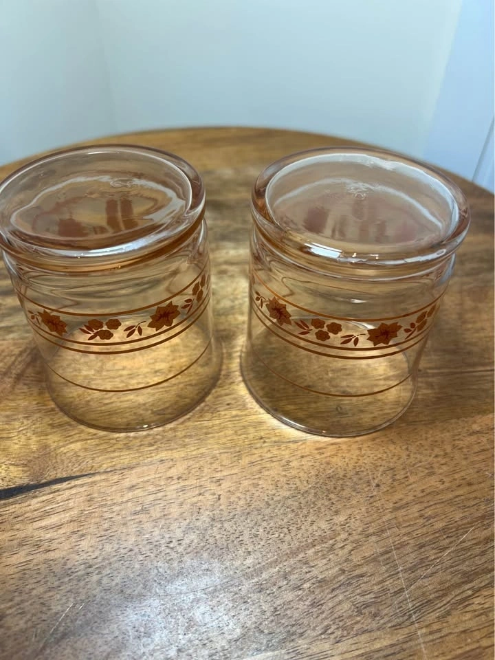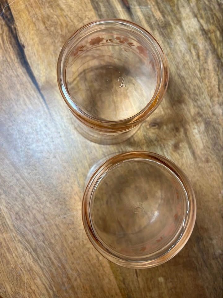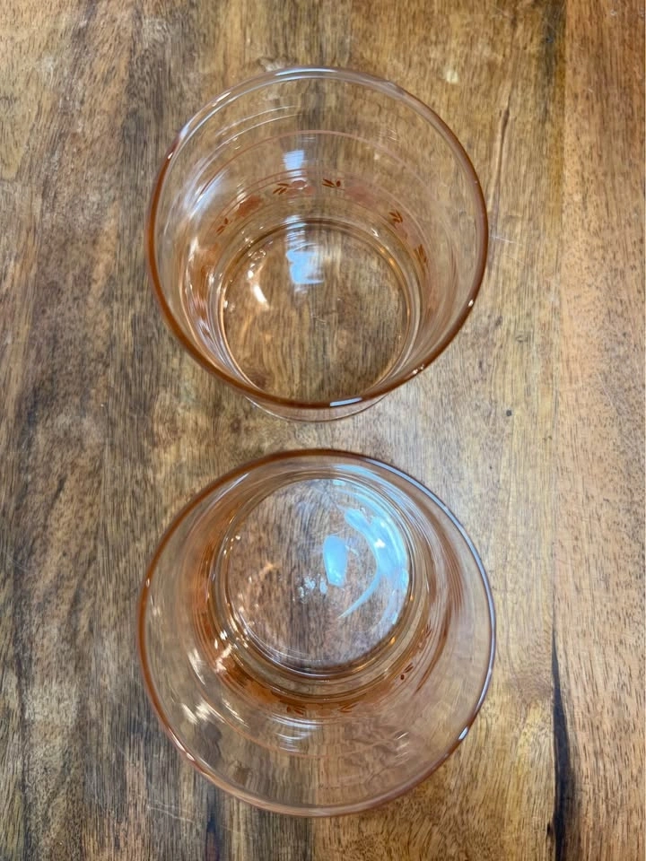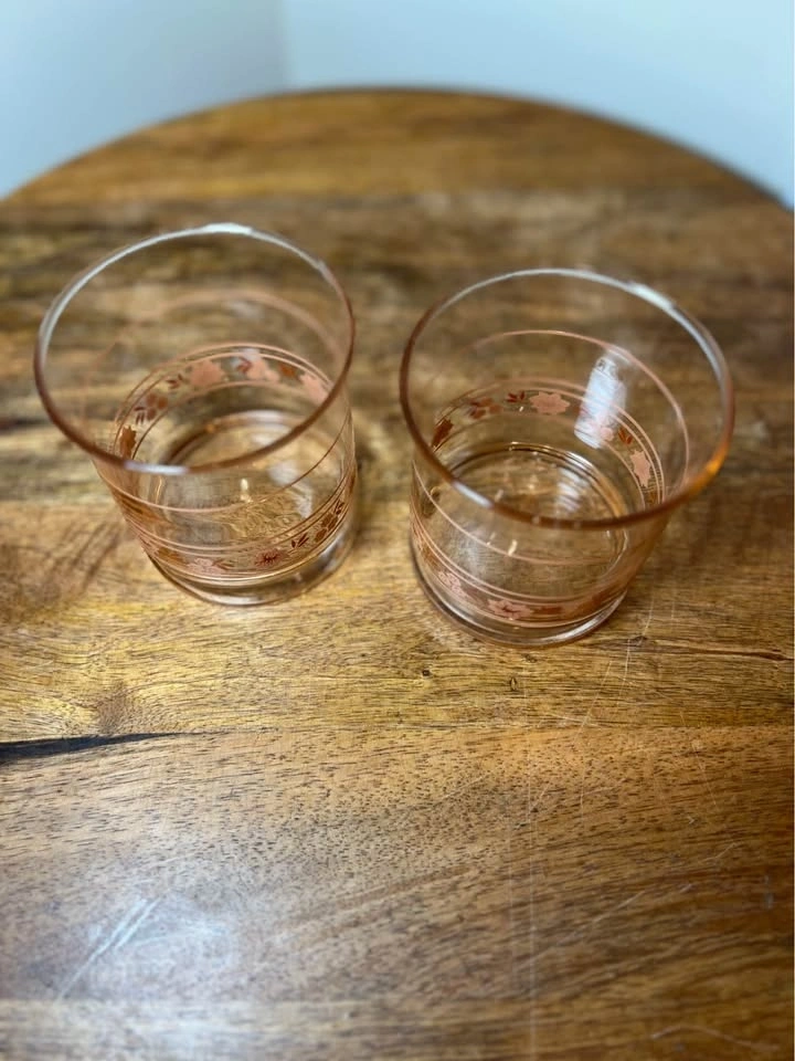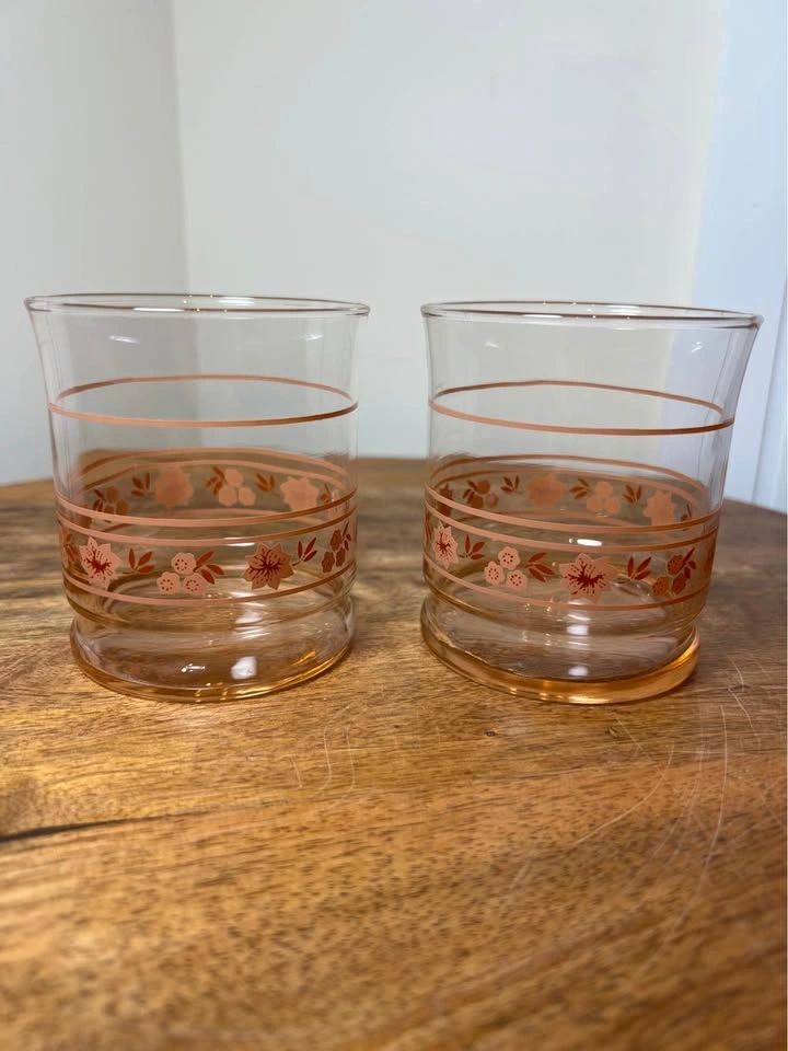 These are vintage Libbey "Peach Blossom" (sometimes called "Pink Blossom") glasses. This mid-century modern glassware features a clear body with a light pink or peach-tinted weighted bottom and is decorated with a peach-pink floral and stripe motif. The specific glasses shown are most commonly identified as juice glasses (roughly 3.5 inches tall) or rocks glasses. Preowned. Pickup is 58th and 7th Ave in midtown Manhattan.