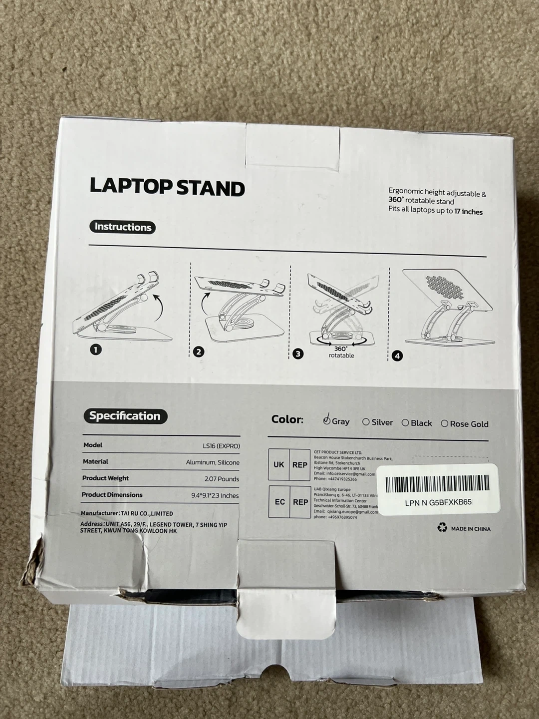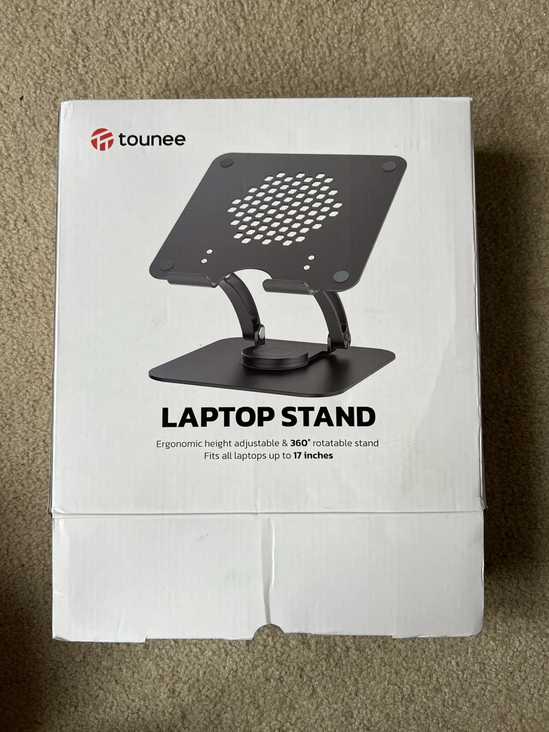47Selling a Tounee laptop stand that's in excellent condition! It's designed to be ergonomic, adjustable in height, and features a 360° rotatable stand. It fits all laptops up to 17 inches. - Model: LS16 (EXPRO) - Material: Aluminum Silicone - Product Weight: 2.07 Pounds - Product Dimensions: 9.4*9.1*2.3 inches It also comes with the original box!