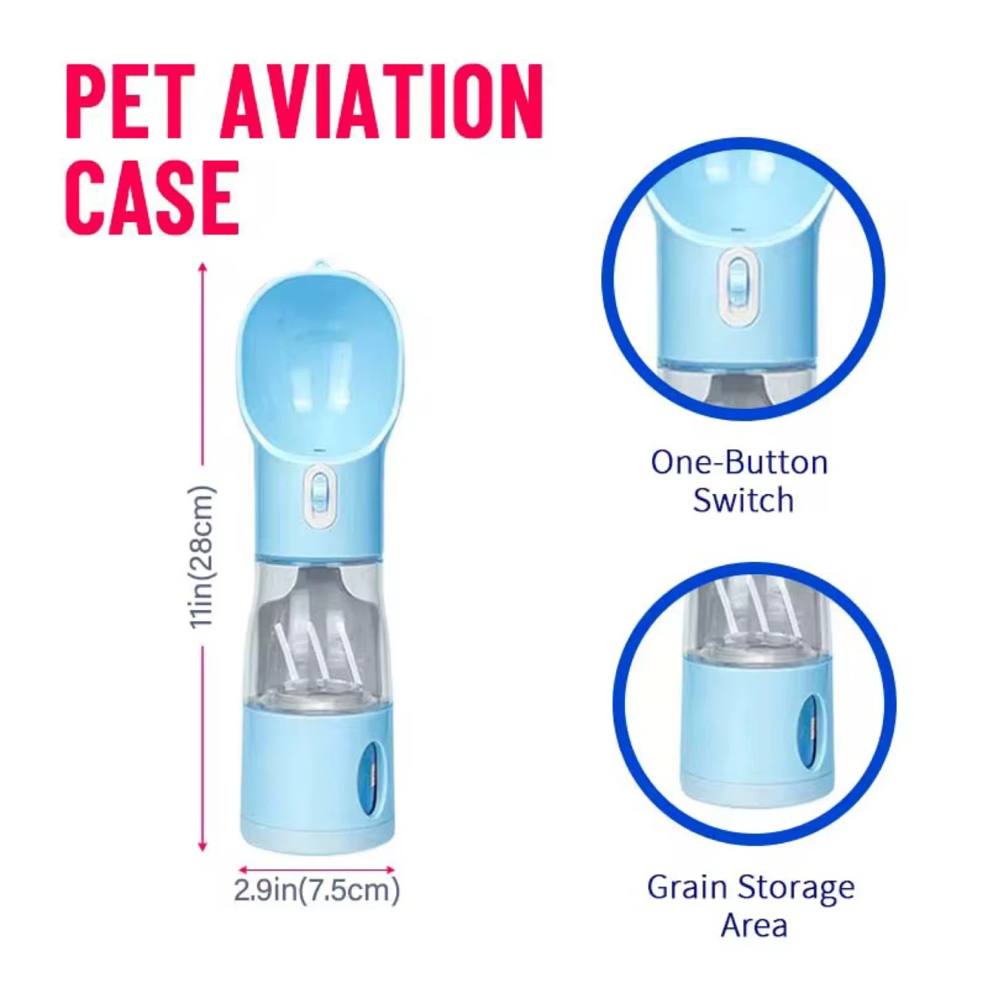 This PETMALIA portable water bottle is designed for pets on the go. It features a water storage area and a separate compartment for grain, plus a built-in poop shovel. The one-button switch makes dispensing water easy. It's 11 inches tall and 2.9 inches wide.