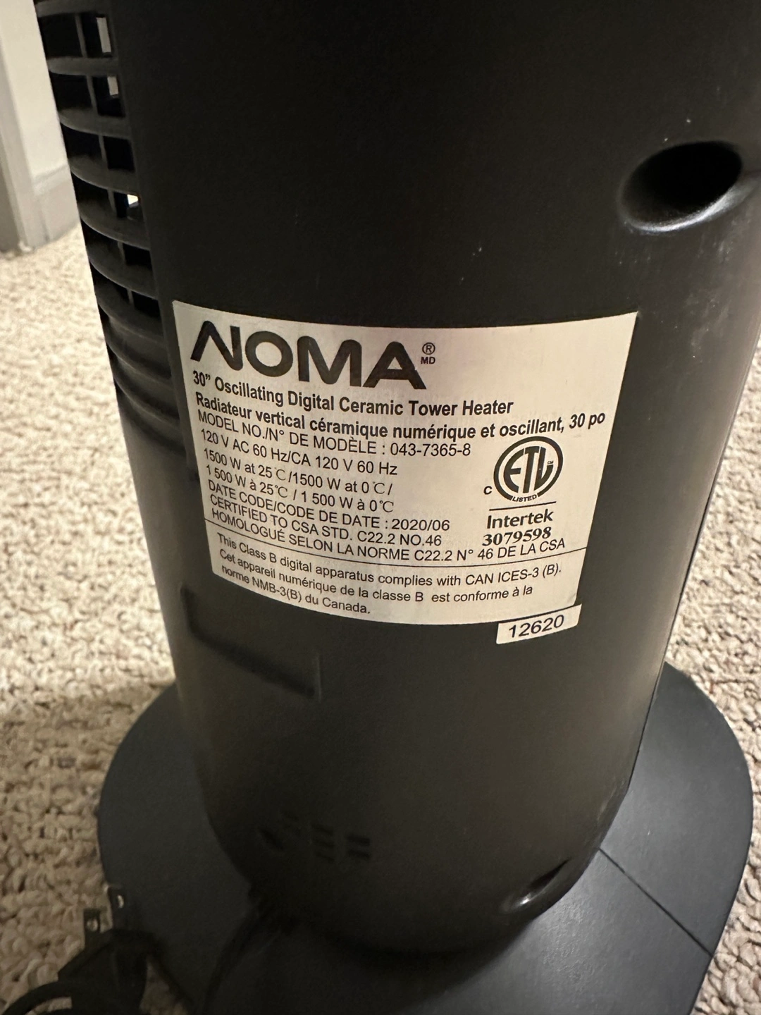 24Black ceramic tower heater. Oscillates 30°. Digital controls. Excellent for supplemental home heating. Moving Out Sale Pickup Only Crescent Heights