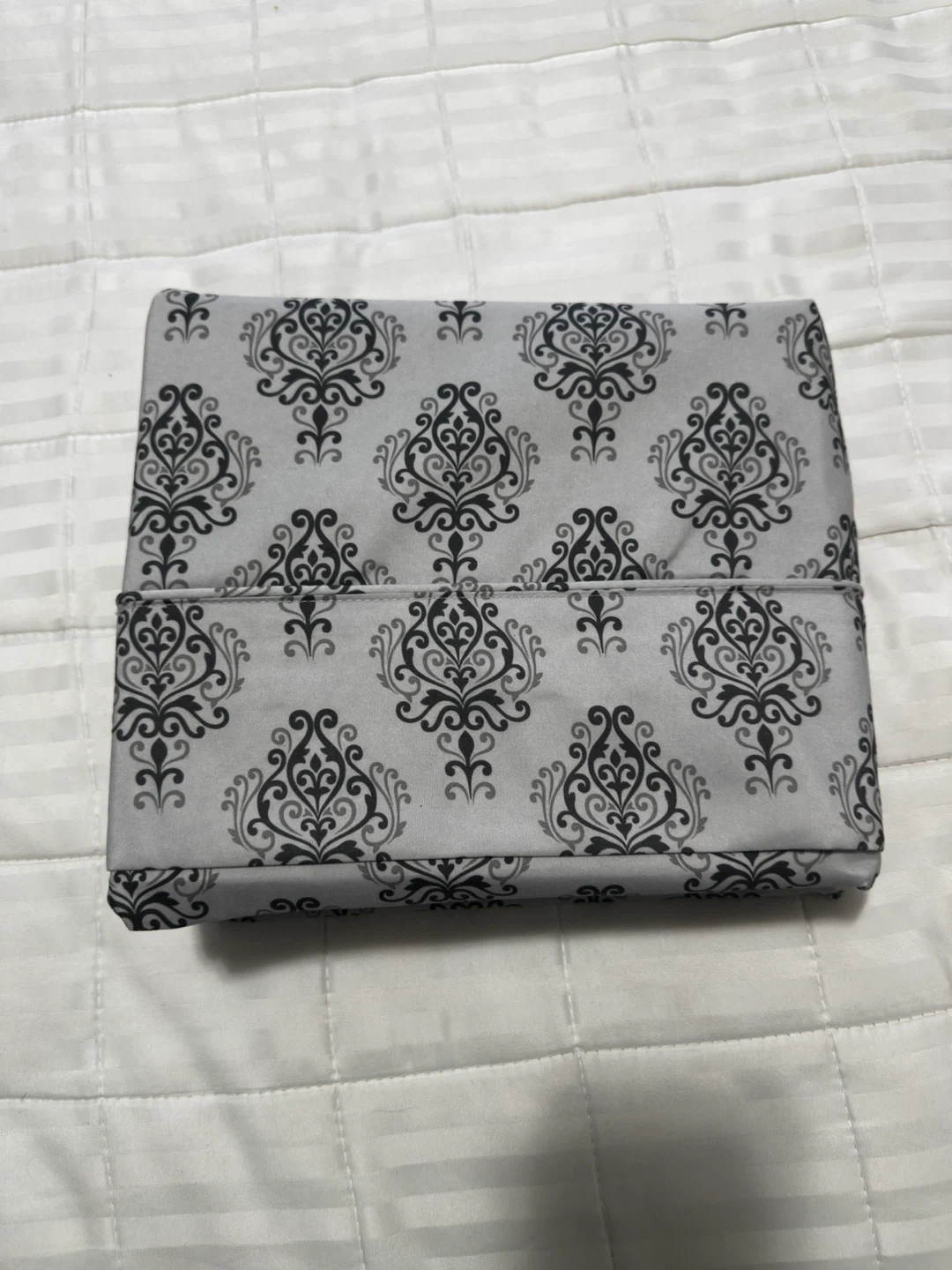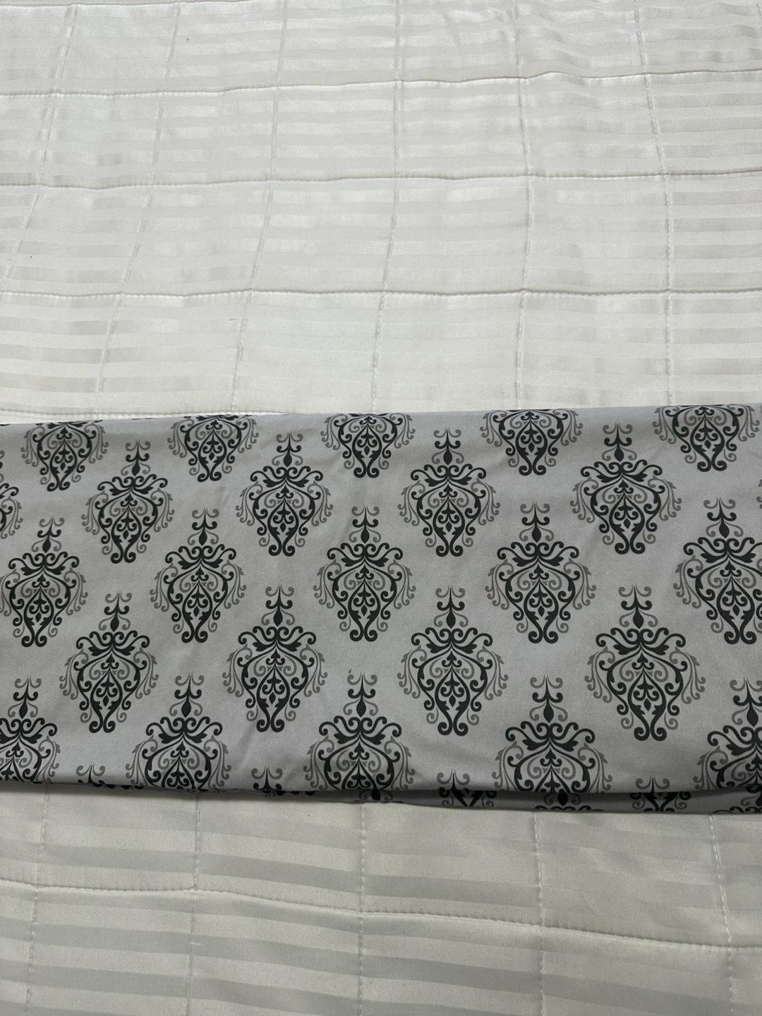 Selling a bed sheet with a grey and black damask-like pattern. It's in great condition and would add a touch of elegance to any bedroom, microfibre bed sheet only , very comfortable