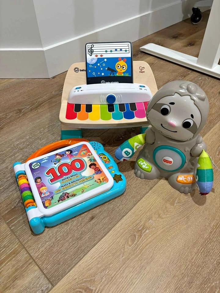 15Includes: - Fisher-Price Linkimals Smooth Moves Sloth - LeapFrog 100 Words About Places I Go Book (Bilingual English-French) - Baby Einstein Magic Touch Piano Wooden Musical Toy All excellent working condition with fresh batteries.
