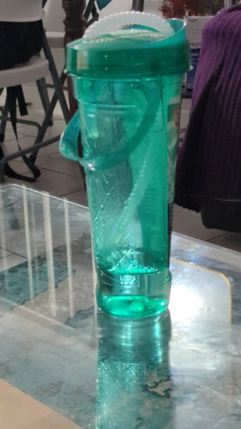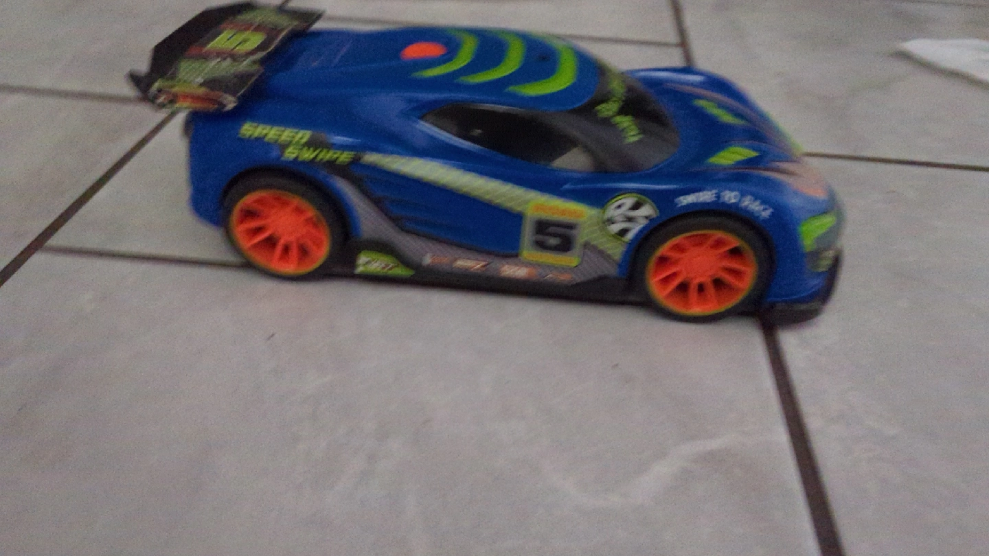 I have a blue toy car with orange wheels and a green water bottle available. They are in good condition and ready for a new home