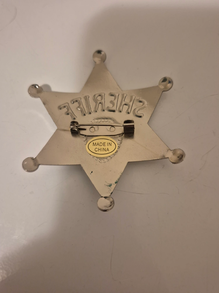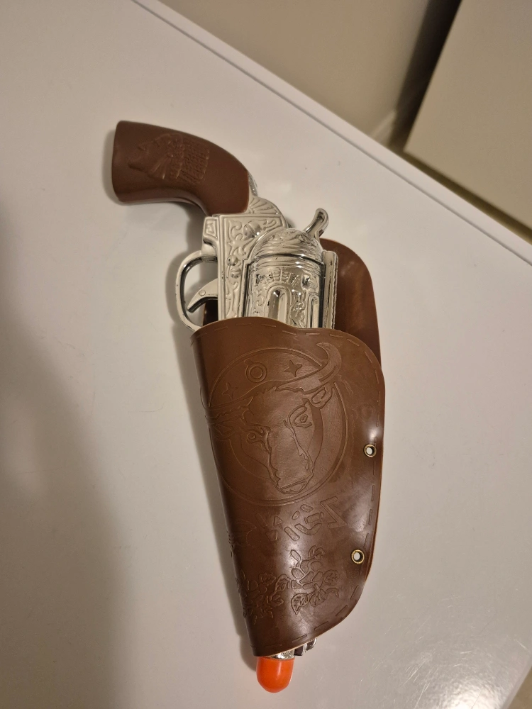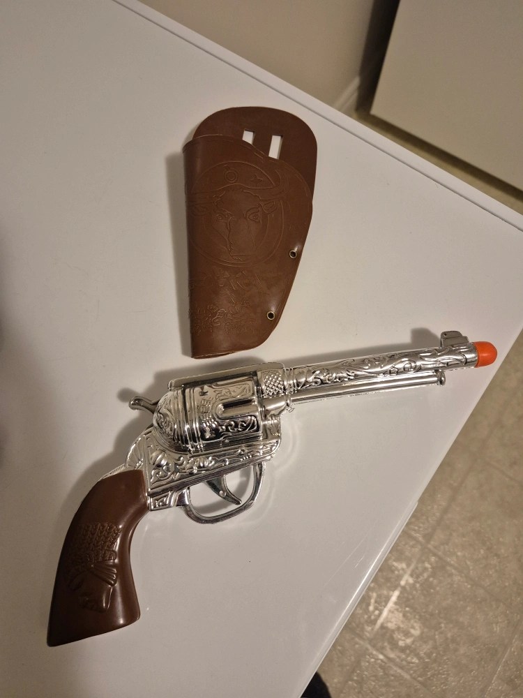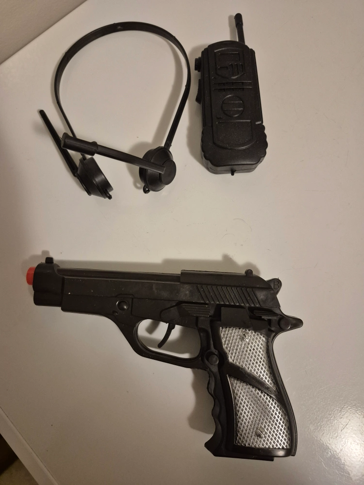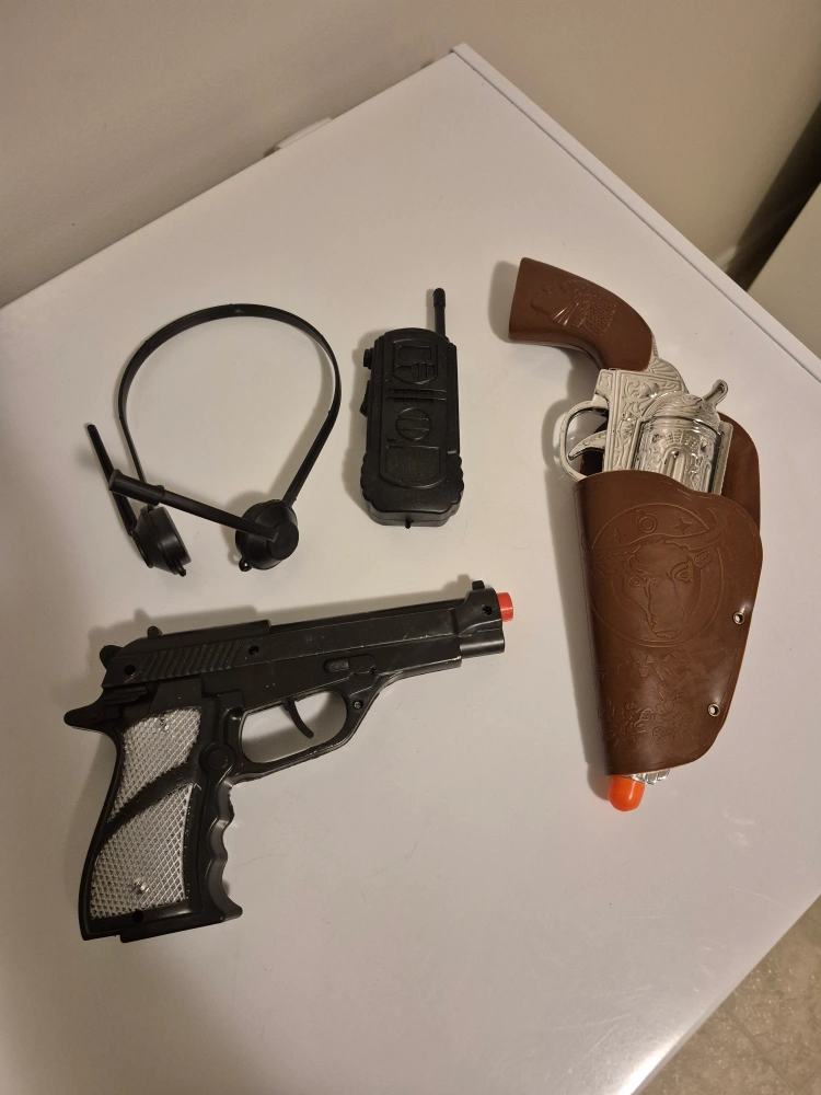 Get ready for some imaginative play with this toy gun set! Includes a toy pistol, a headset, and a walkie-talkie for a Secret Agent costume Also a western style gun, holster and Sherriff's metal badge for cowboy Sherriff costume! Perfect for dress-up and pretend adventures!! Curbside pickup M-Sat 5pm-9pm Only!!