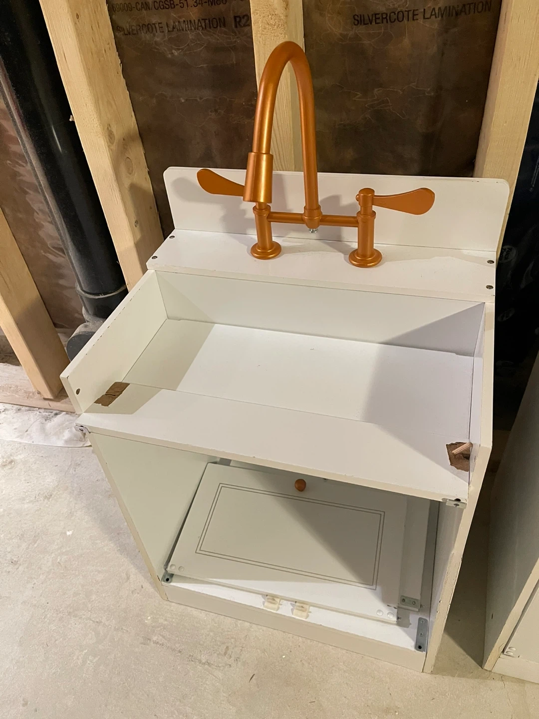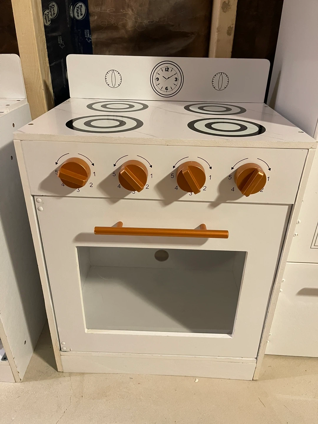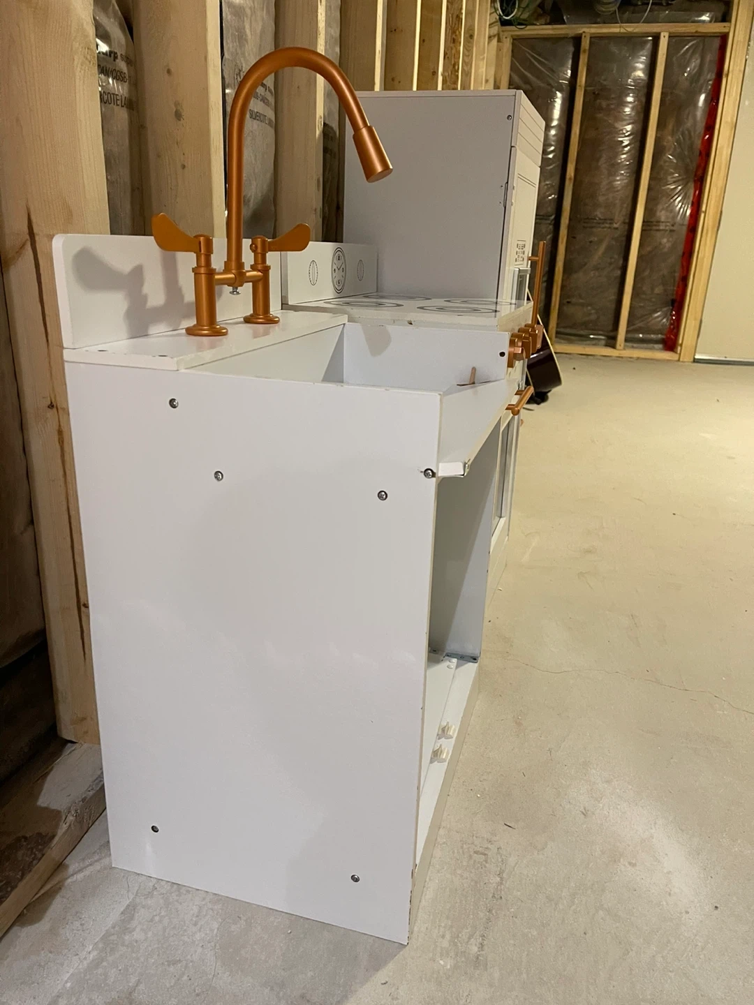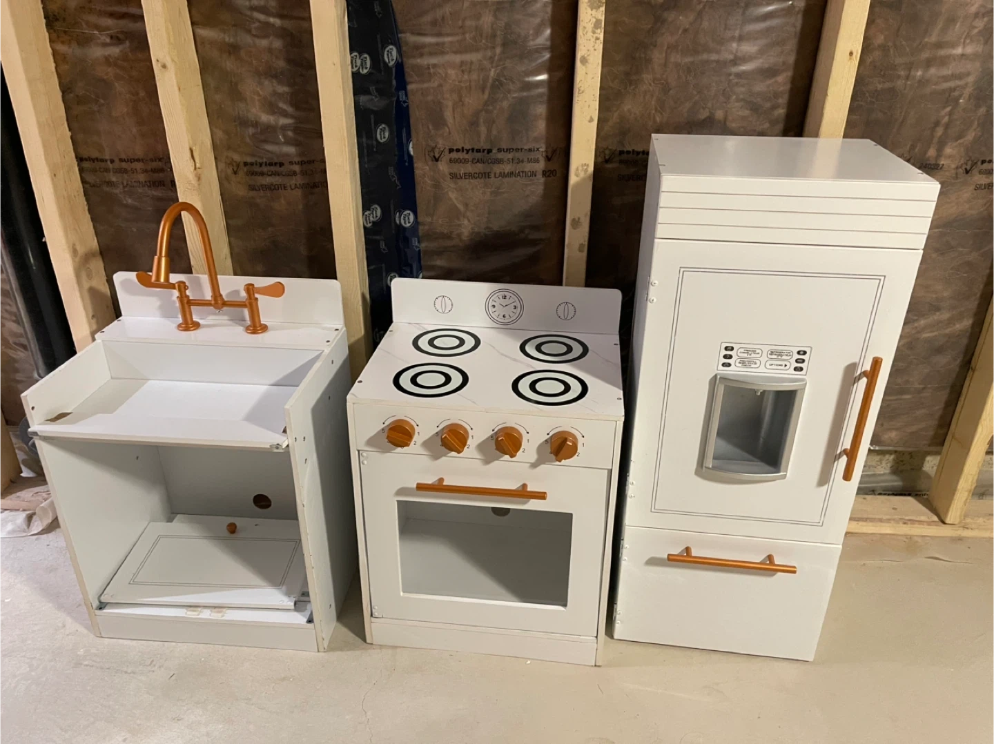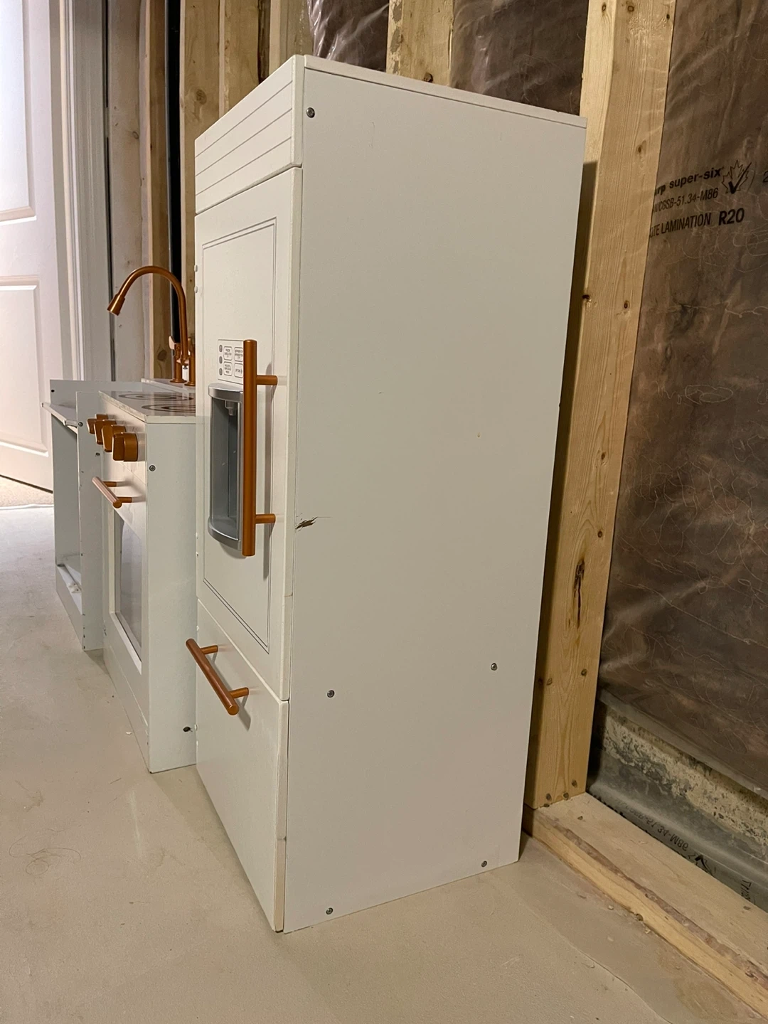 Selling a cute toy kitchen set! Includes a sink, stove, and fridge. Perfect for your little chef to play with. Has damage from moving and water, can be repaired/repainted - see photos The set is white with copper accents.
