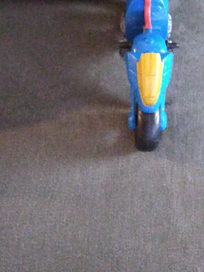 Selling a blue toy motorcycle. It's in good condition and ready for a new home! It features a yellow front detail and red accent.