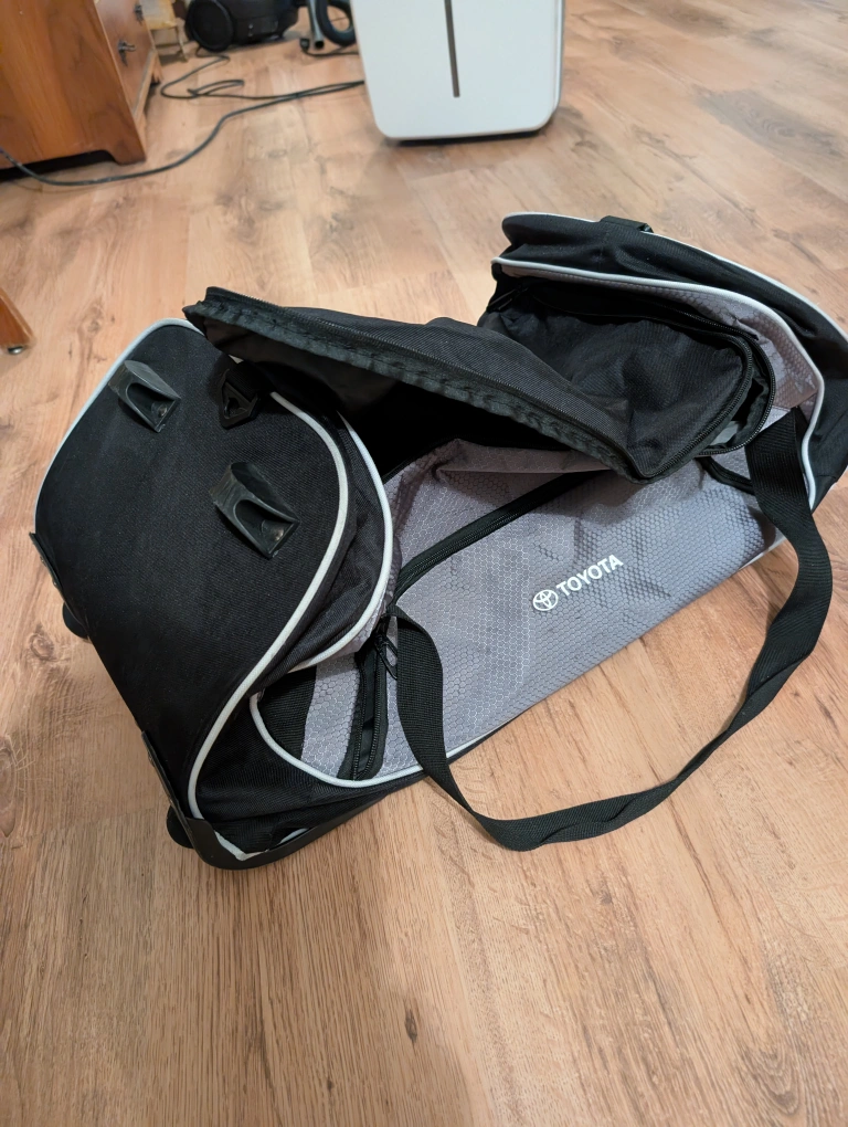 Here's a Toyota duffle bag in black and grey. It's in great shape and ready for your next adventure!