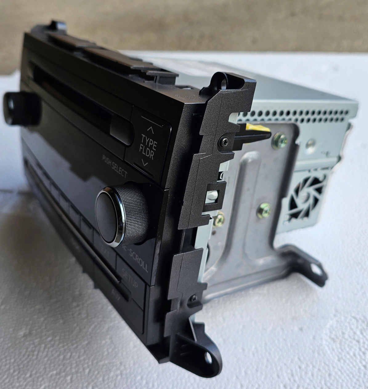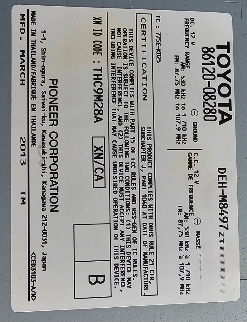 Used Toyota car stereo. Includes faceplate and mounting brackets. Made in Thailand by Pioneer. Model number DEH-M8497ZT. Part number 86120-08280. Features CD player, radio, and auxiliary input.