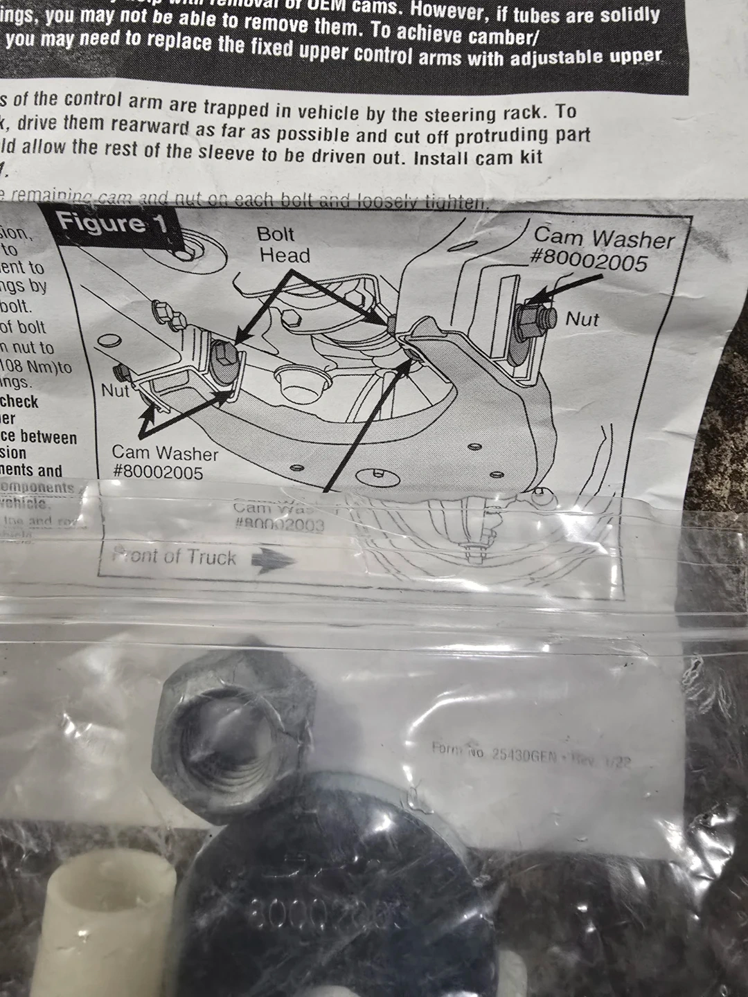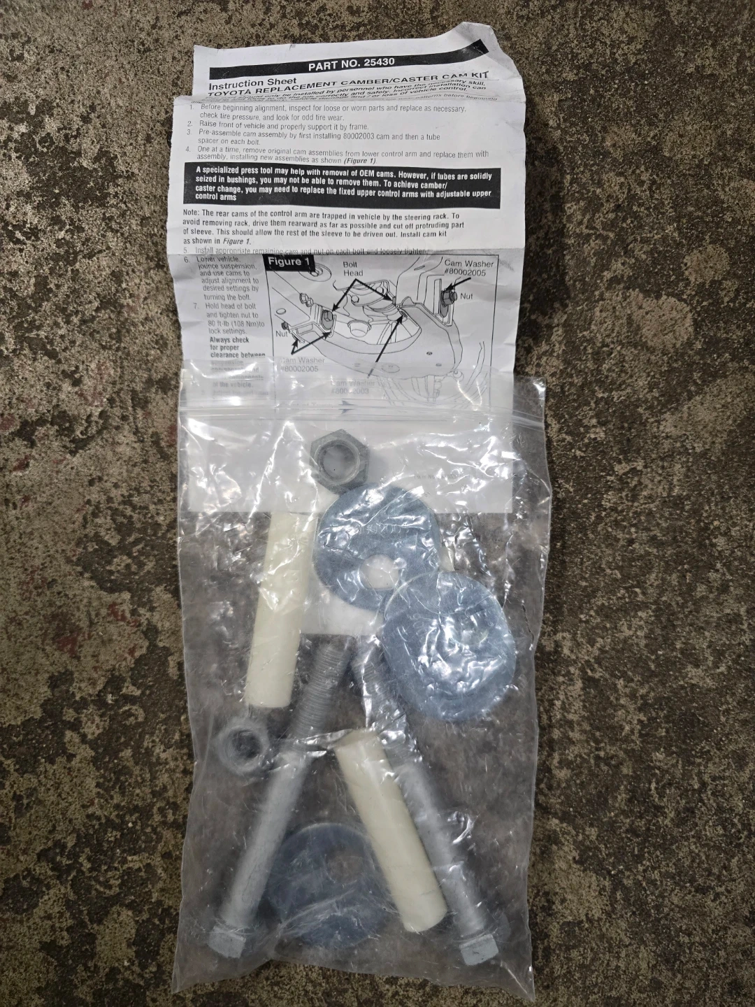 60Selling a Toyota Replacement Camber/Caster Cam Kit, part number 25430. It includes the instruction sheet. Perfect for adjusting camber and caster angles on your vehicle
