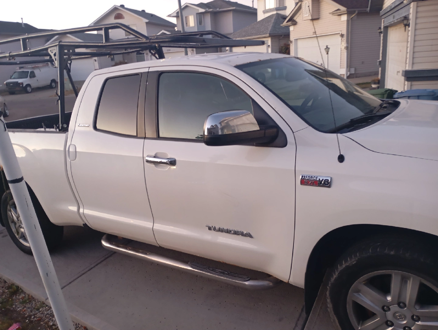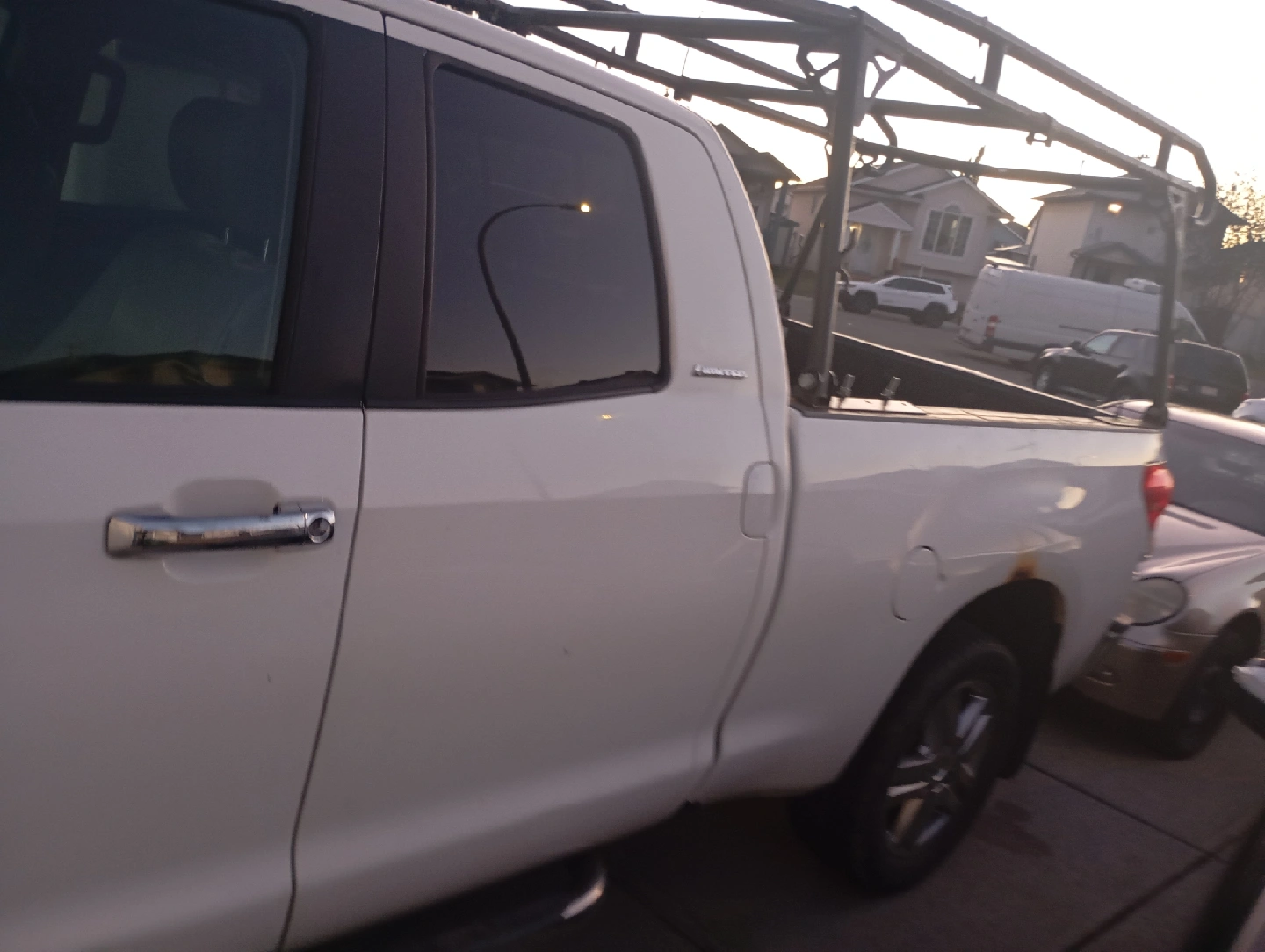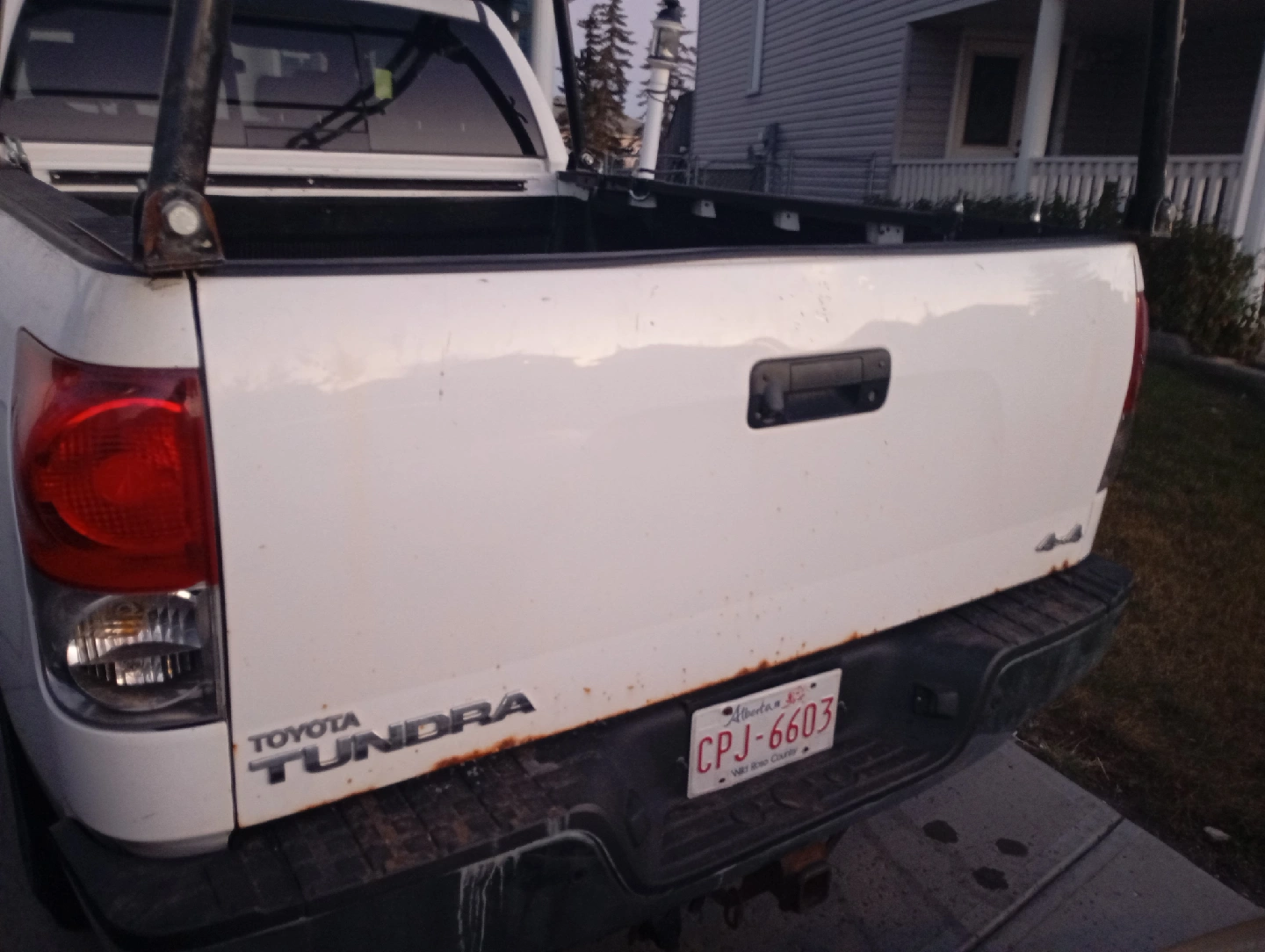 Selling a Toyota Tundra truck. It has a rack installed. There are some signs of wear and tear, including rust and scratches, as shown in the pictures