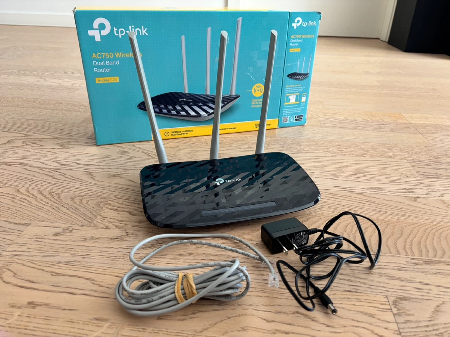 Selling a TP-Link AC750 Wireless Dual Band Router, model Archer C20. It comes with the box and all included components. This router is perfect for providing reliable internet access throughout your home. It's easy to set up and offers great performance for everyday use!