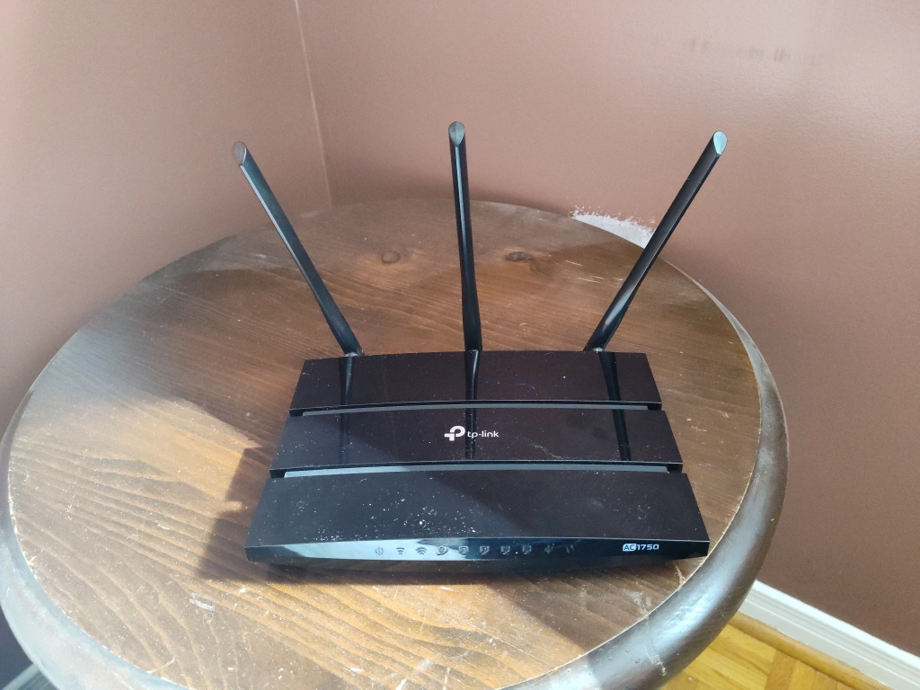 Black wireless router. Three antennas. Model number AC1750. comes with Power adapter and a Internet cable.