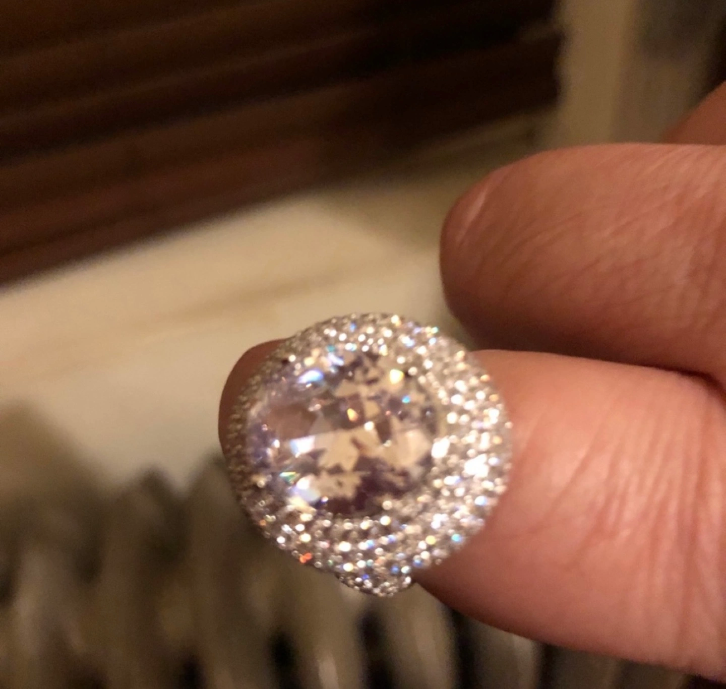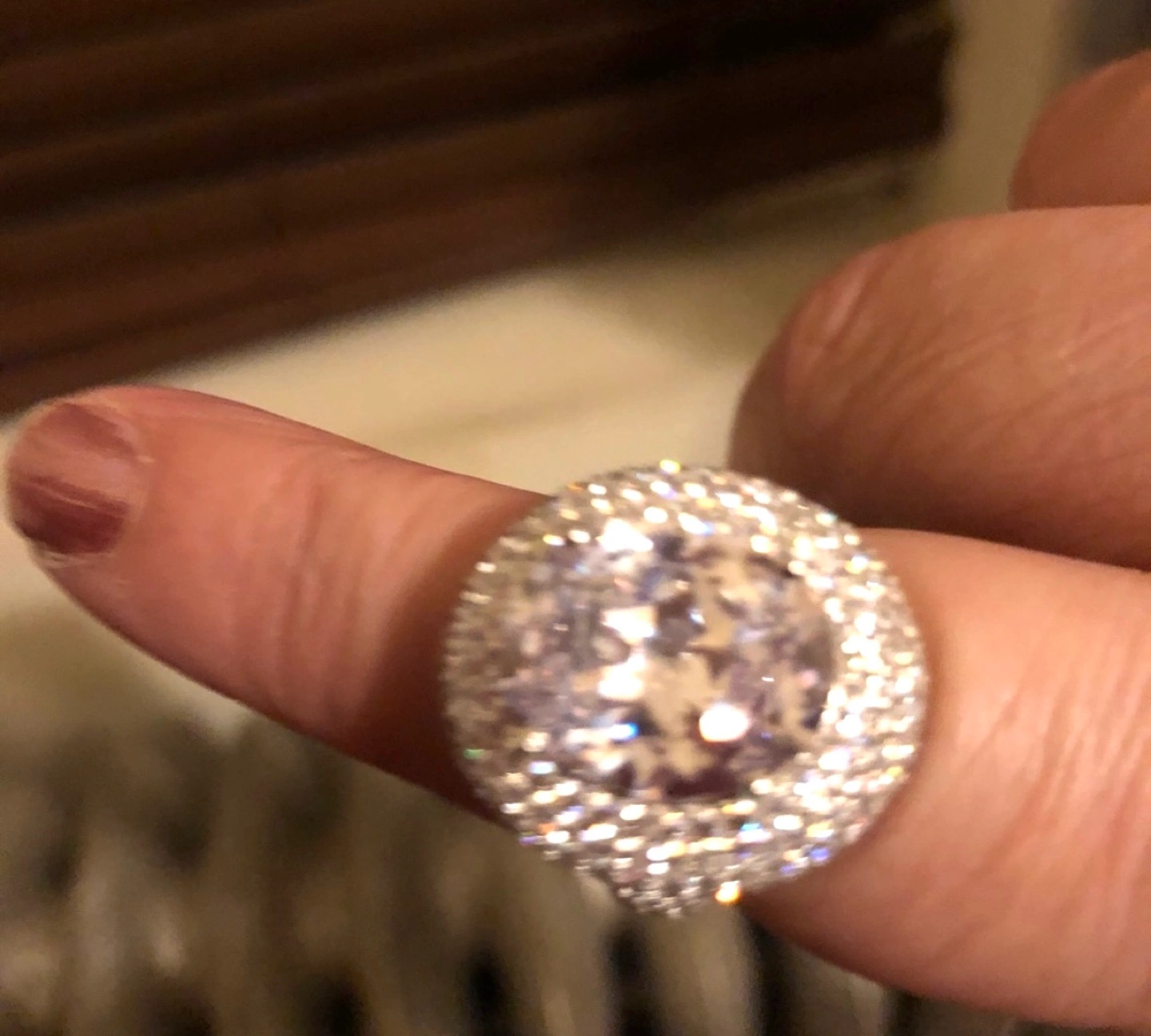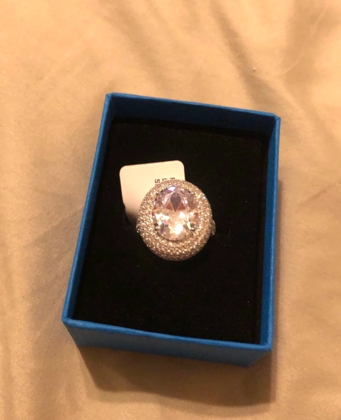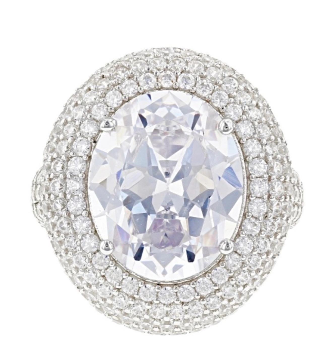 Large oval-cut cubic zirconia center stone. Double halo of smaller cubic zirconias. Silver band. Sparkly and eye-catching.