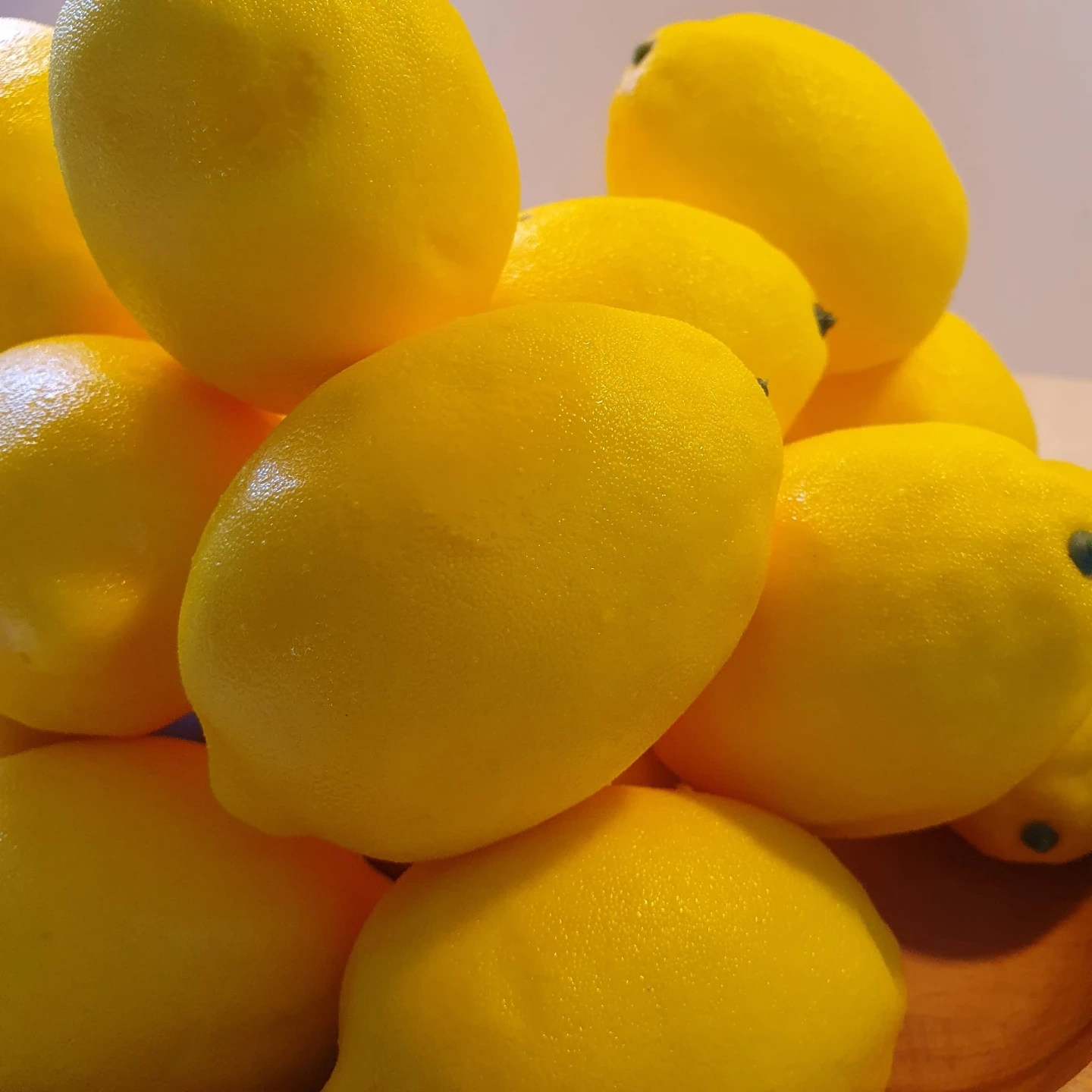 A bowl of decorative lemons. These are for display purposes and add a pop of colour to any space. They look like real lemons but aren't edible.