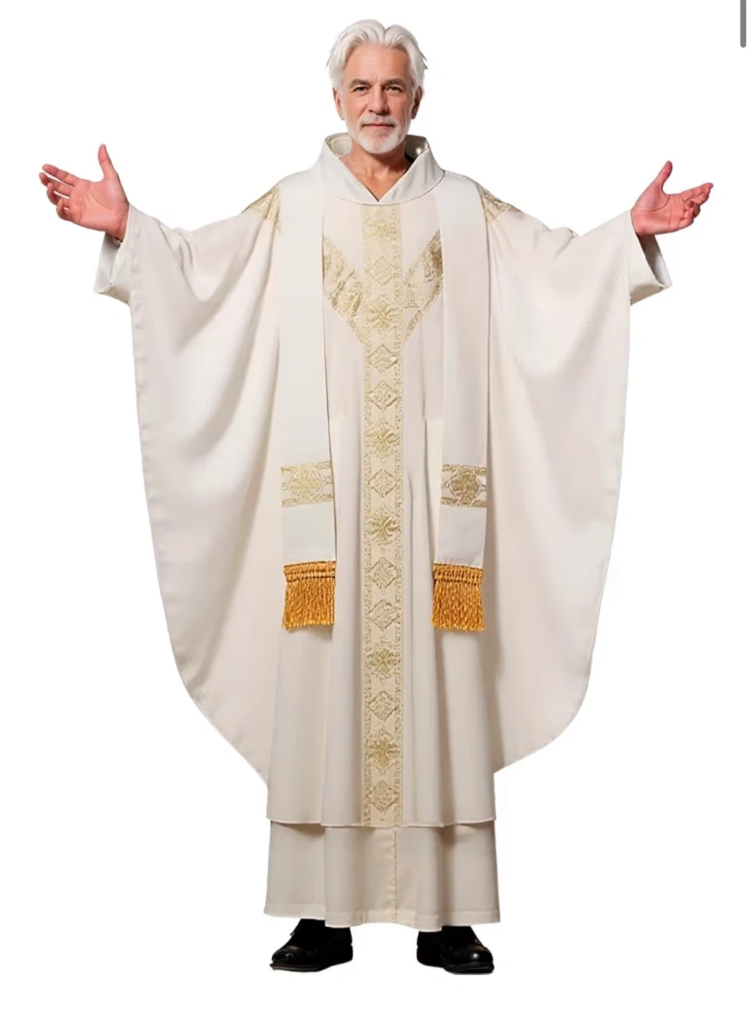 This is a white Catholic priest chasuble with gold embroidered details and fringe. It's designed for church services and vestments. Made with quality fabric for comfort and durability.