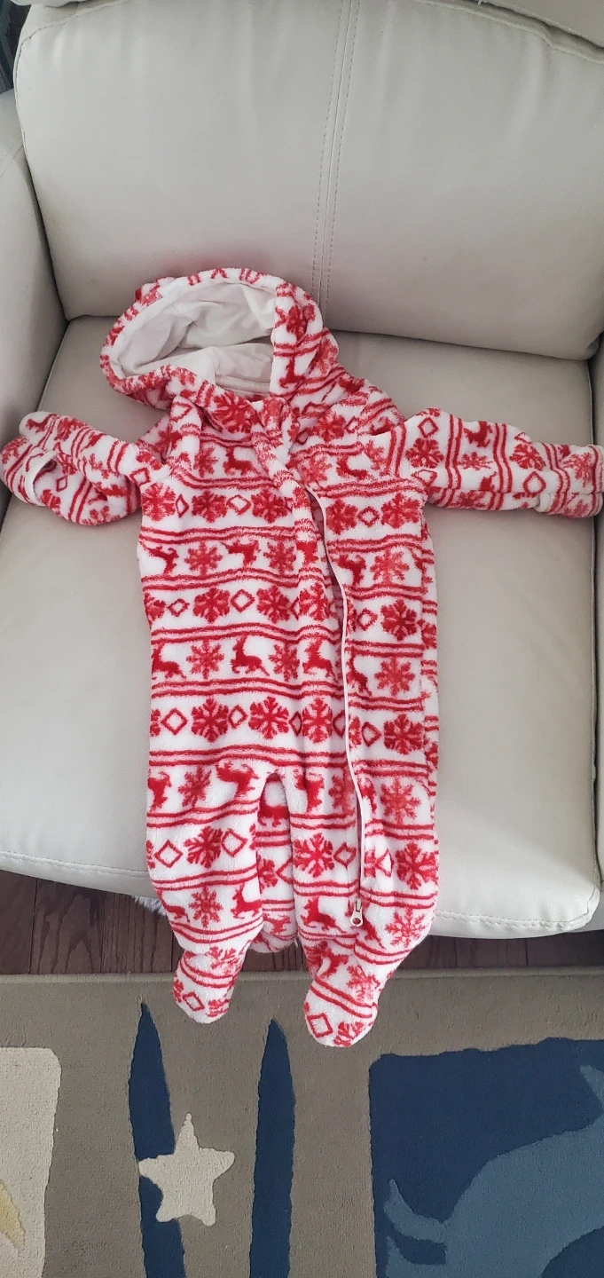 Cozy red and white snowflake and reindeer patterned fleece snowsuit for baby. It has a zipper closure and a hood. Soft plush material.