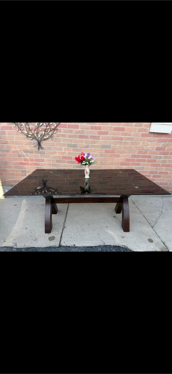 Beautiful Glass Table with a Dark Wood Base Crossed Legs