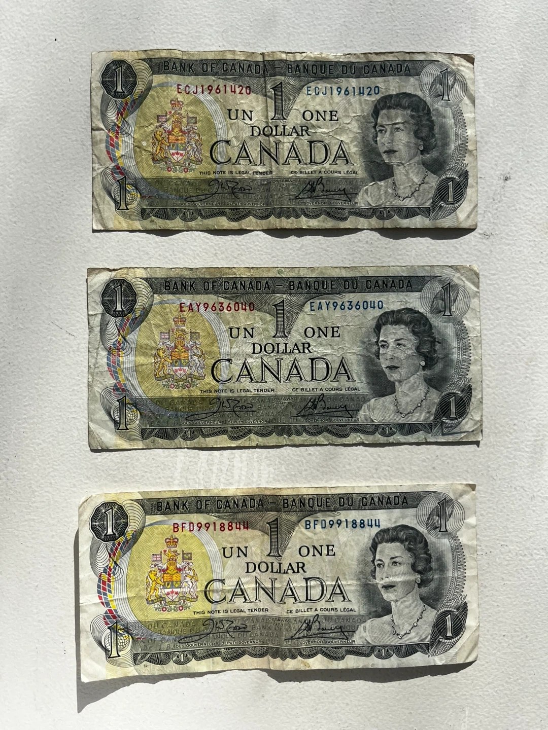 Three older Canadian one dollar banknotes from 1973. Features Queen Elizabeth II on the front and Parliament Hill on the back.