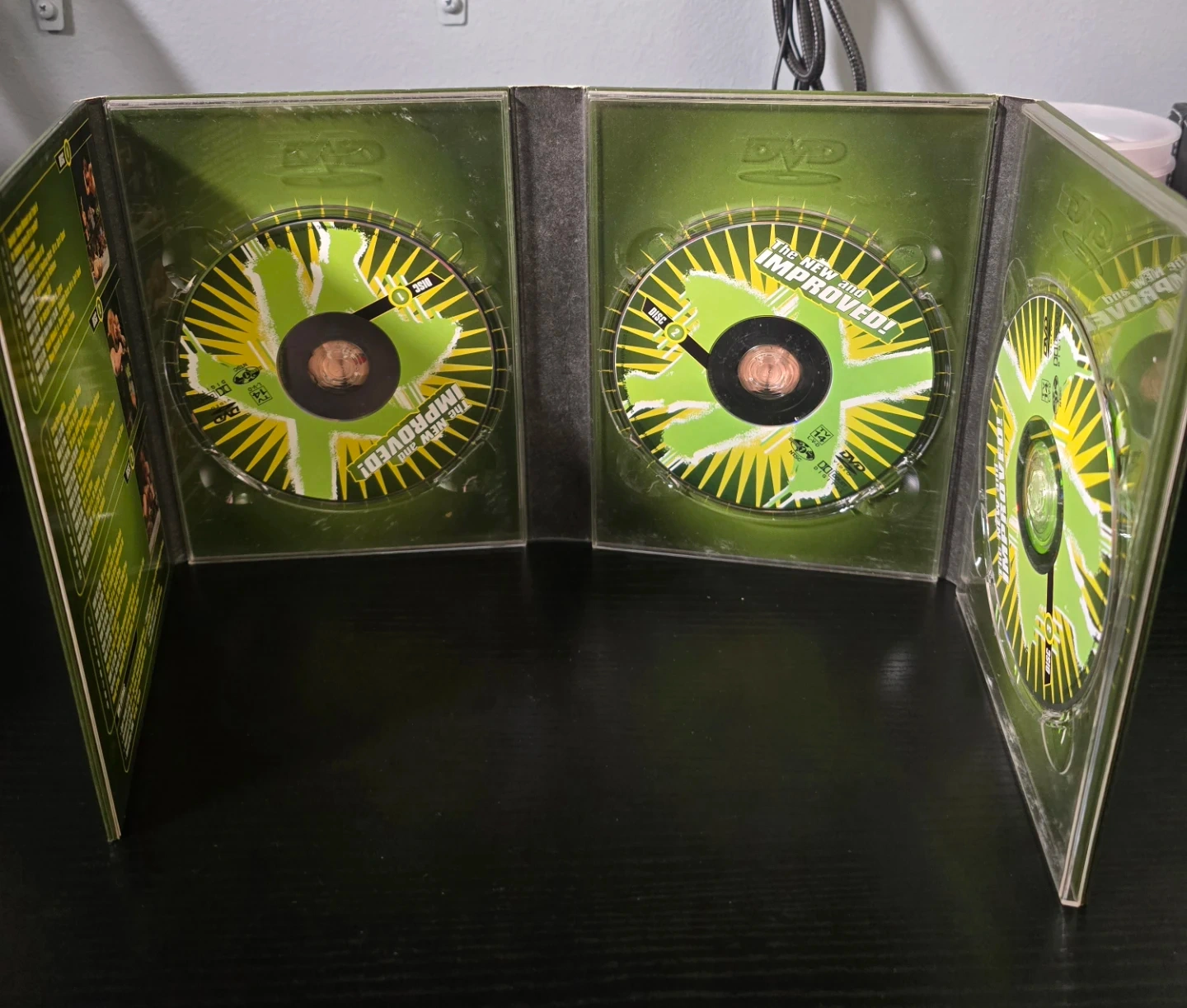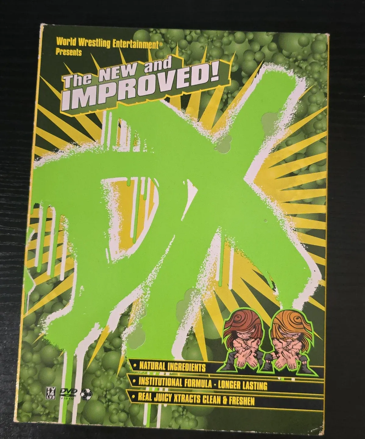 This is the World Wrestling Entertainment DX The New and Improved! DVD set. It includes multiple discs for a full viewing experience. Natural ingredients, institutional formula, and real juicy xtracts are listed on the packaging.