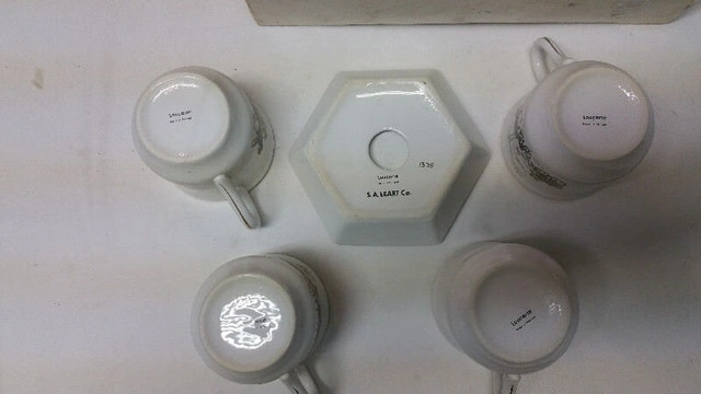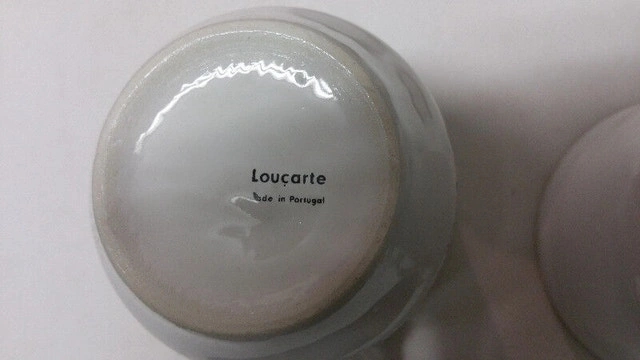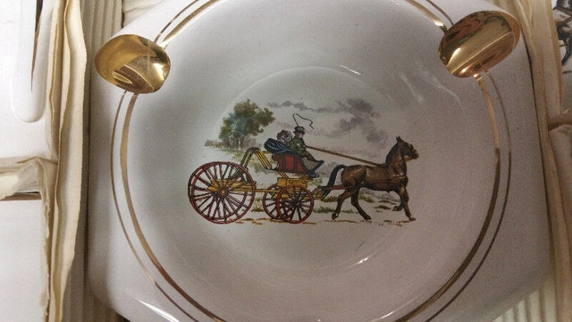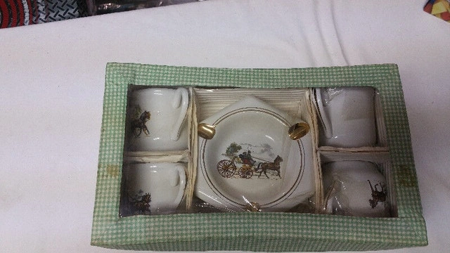 Up for sale we have this New Vintage set of 4 Coffee Cup Mugs and one Ashtray Made in Portugal By Loucarte S.A.Leart Co. the set future a couple riding a Carriage (buggy)with a horse The protective plastic on top of the box is rip but the set is still Brand New. I have 2 set available